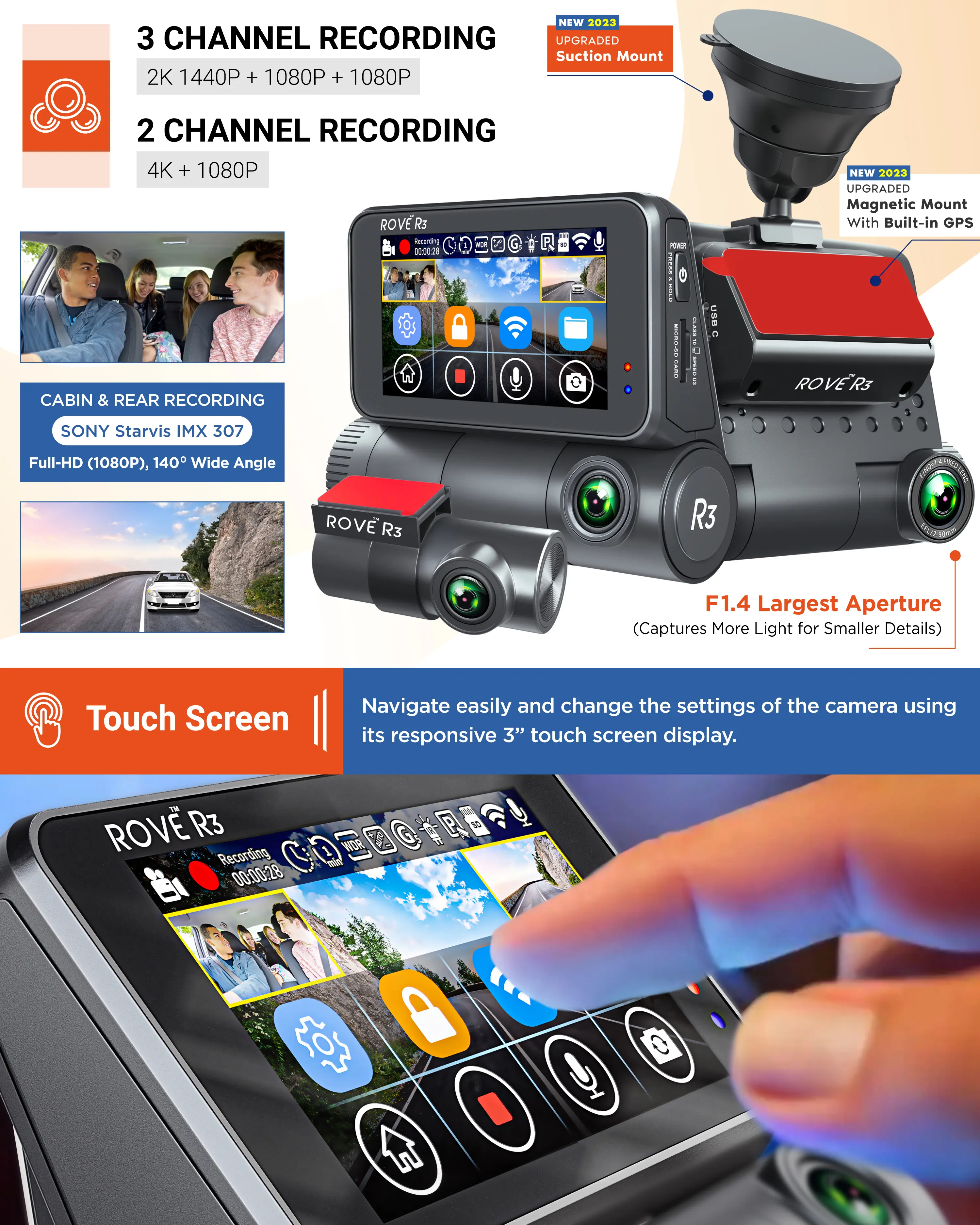 Introducing the ROVE R3, a revolutionary 3-channel touch screen dash camera that redefines the driving experience. Crafted with precision over 1.5 years, this smart dash camera boasts a stunning 3-inch IPS touch screen and a single power button, seamlessly controlled by ROVE's custom firmware.