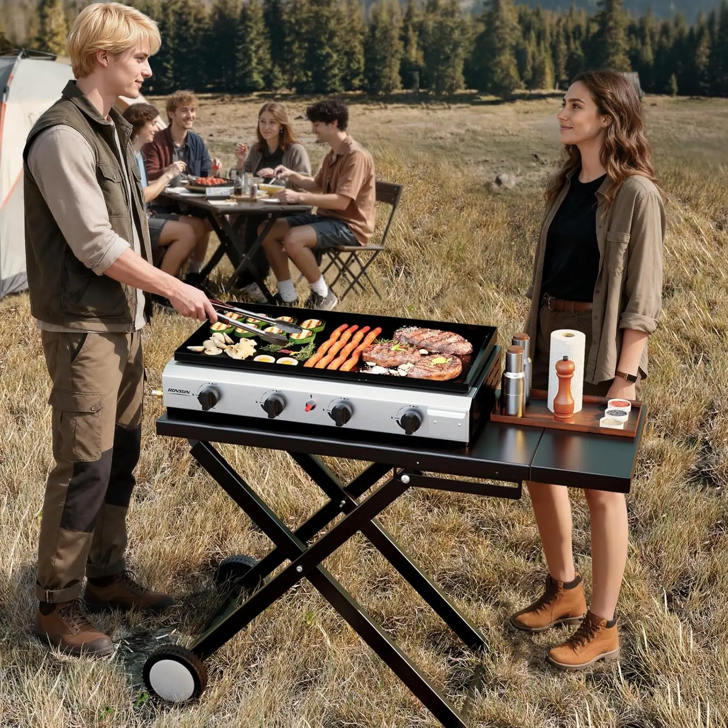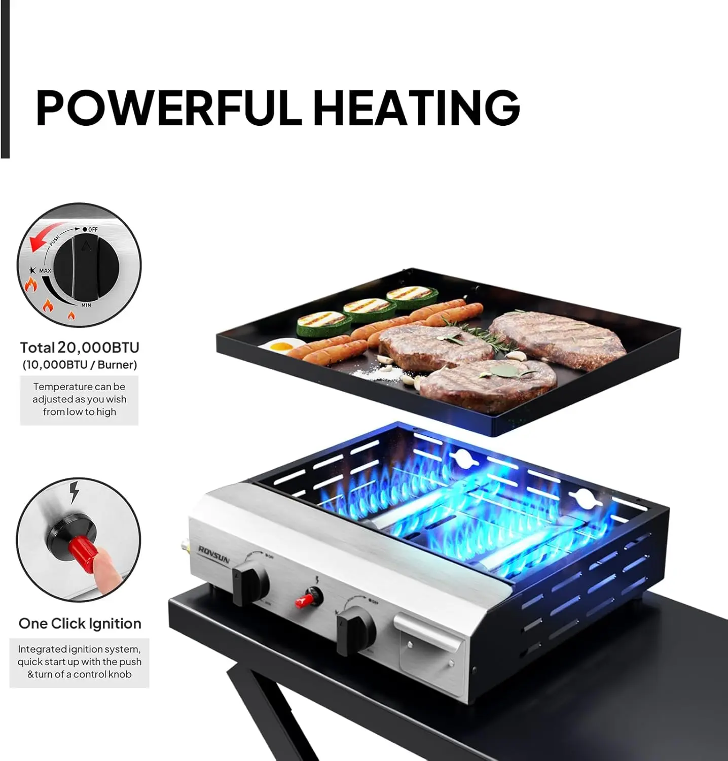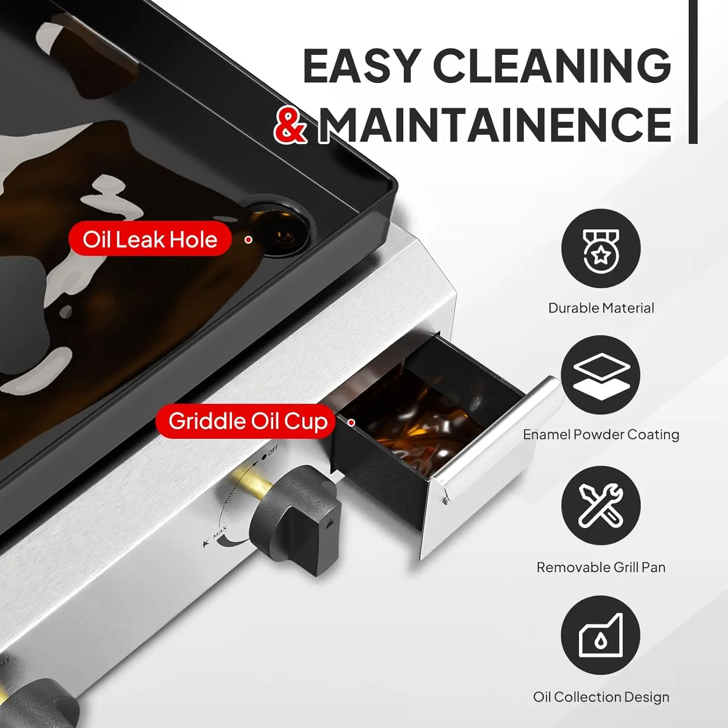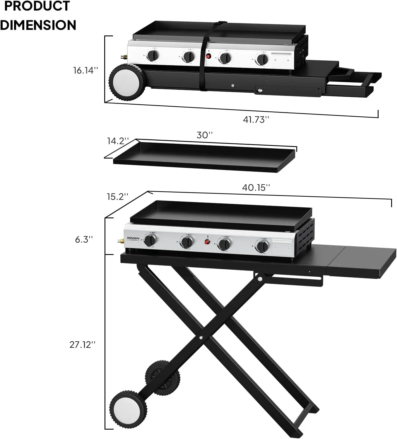 ROVSUN High-quality Porpane Griddle, a perfect companion for all your culinary adventures. Equipped with 4 independent stainless steel burners, it delivers a powerful combined heat of up to 40,000 BTUs. The flame is adjustable, catering to diverse cooking needs. Crafted from robust stainless steel and iron, it promises durability and lasting performance. It features an oil drip tray for easy cleaning post-use and a user-friendly hose and valve connection design, saving you time and money. With a generous cooking area of 426 square inches, including a 30'' × 14.2'' cooking zone, it offers ample space for grilling enthusiasts. Our freestanding griddle is easy to install with quick "folding & unfolding" and compact for easy mobility. Whether you're planning outdoor grilling, camping, picnicking, or boating, our griddle is your go-to choice.