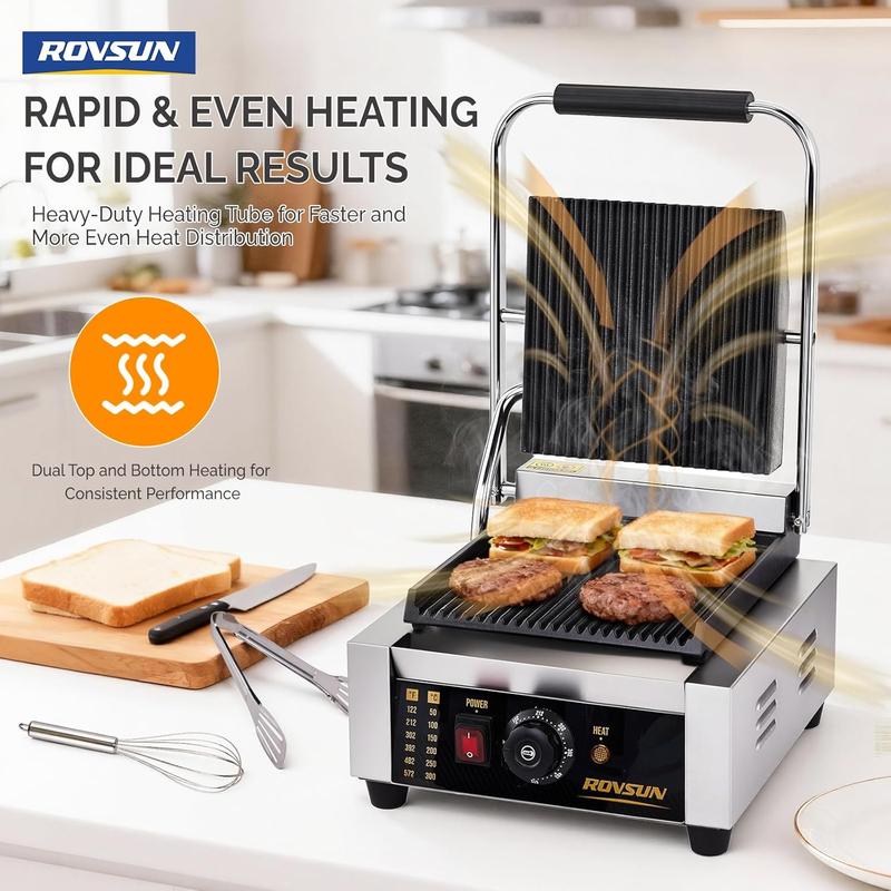 ROVSUN Commercial Panini Press Grill, Stainless Steel Electric Countertop Sandwich Maker with Adjustable Temp 122°F–572°F, For Steak, Burgers, Home & Restaurant Use, 110V, Silver
