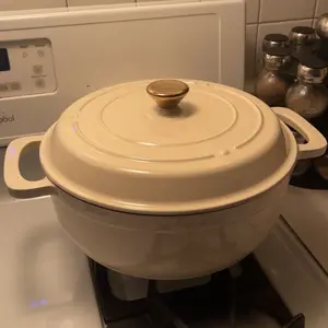 Beautiful enameled cast iron pot, I need one bigger than the previous one I had so I got this one which 7.5 quarts and it’s big, I can’t wait to cook in this pot.