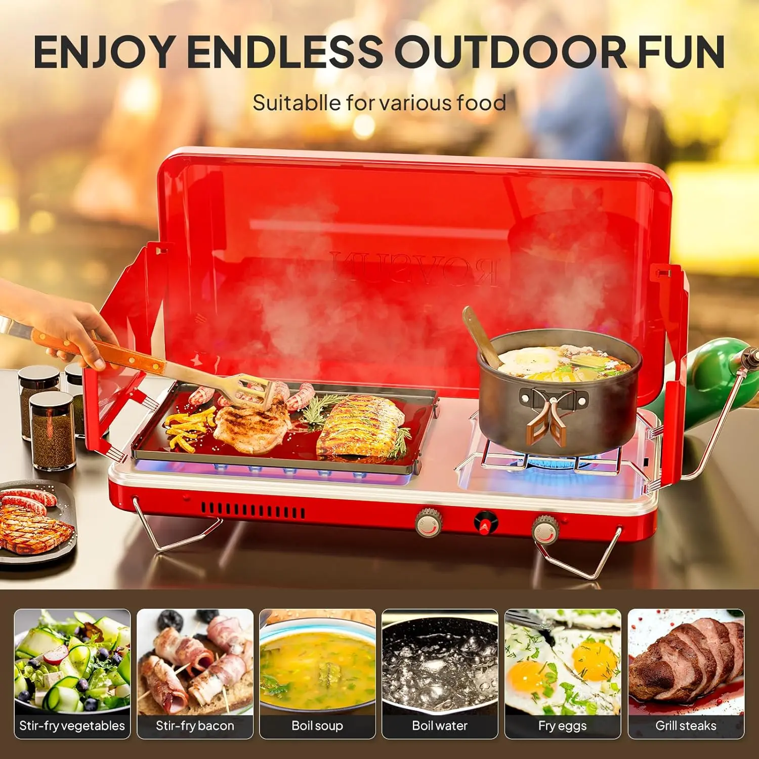 ·【2-IN-1 Stove & Grill】The combination design of the stove and griddle allows you to make delicious French toast, frying meat, grilled shrimp, grilling hot dogs, sandwiches, Mexican tortillas, etc. The high-quality griddle can quickly heat up through automatic ignition and provide precise temperature control through the knob