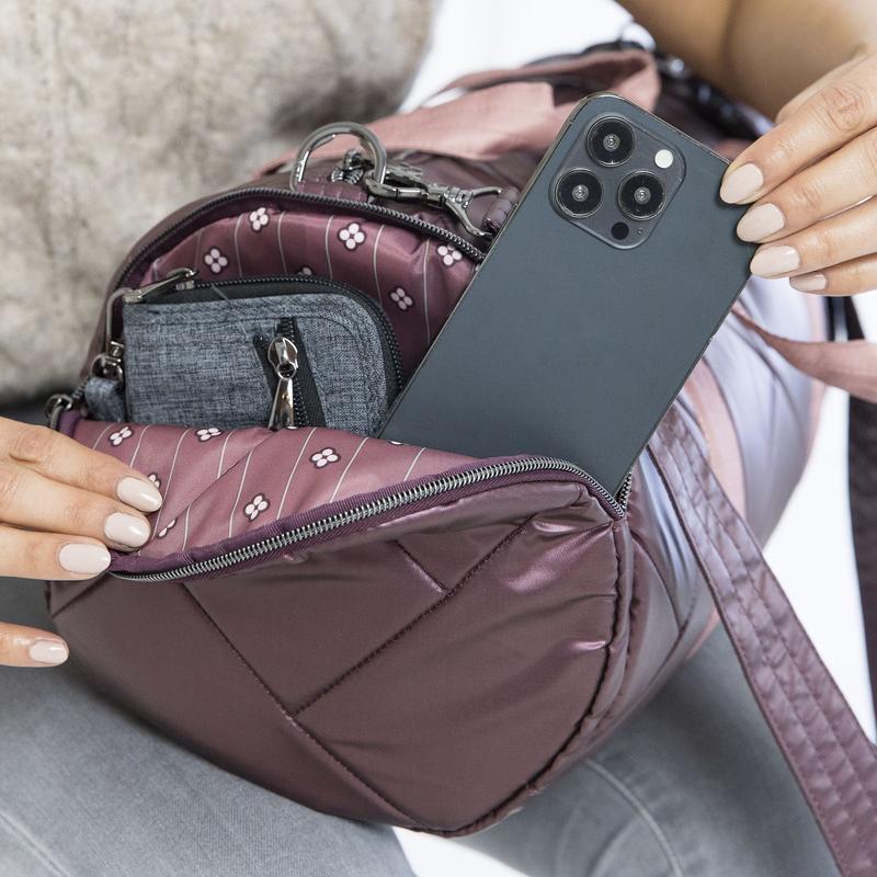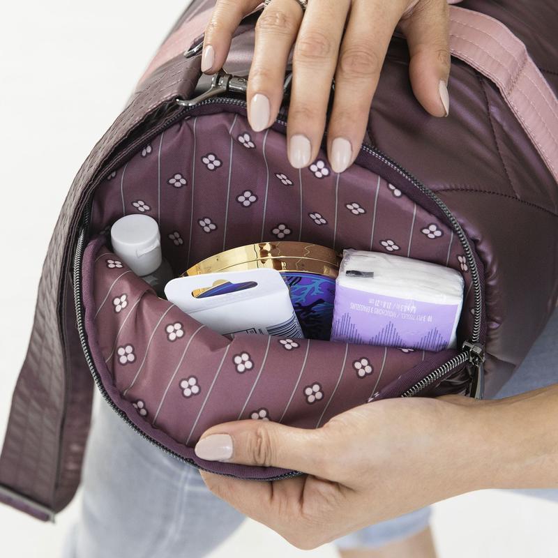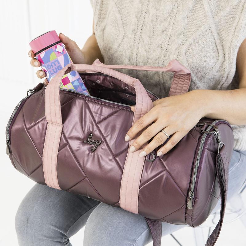Love this new duffle from Lug. Its round tubelike shape reminds me of my high school duffle bag Inused to take with me. That METALLIC INSIGO goes very well with all of the denims and blues in my wardrobe. Good space inside and fits very well underneath the plane seat and I still have easy access to what’s inside the bag.