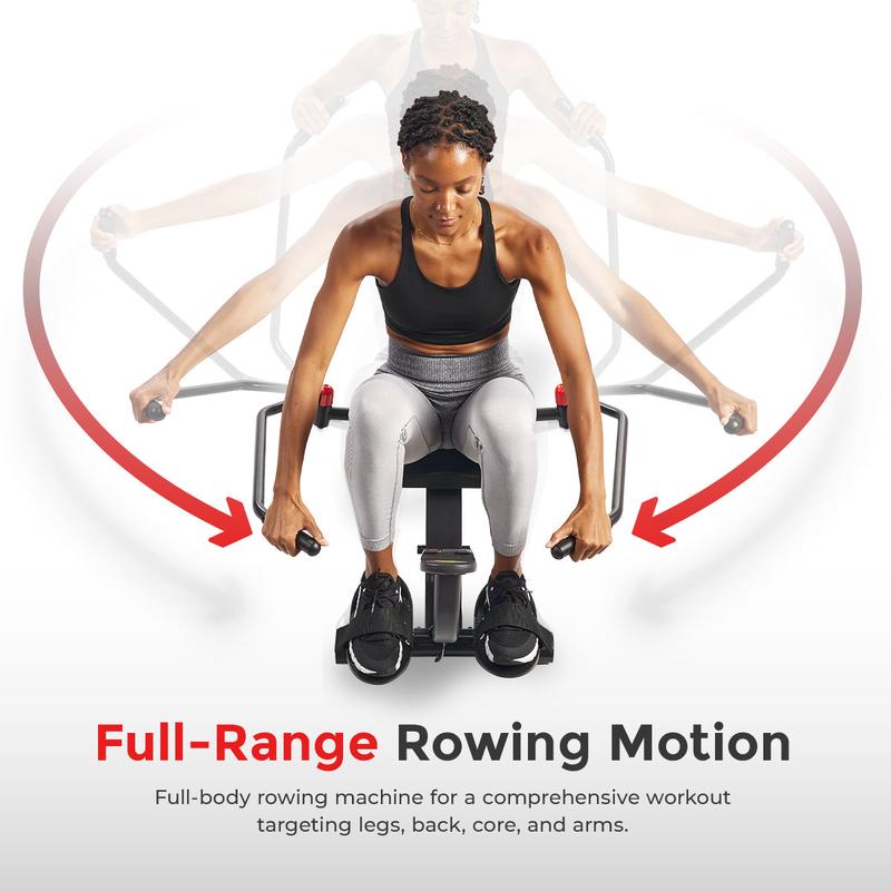The full-motion handlebars on this rowing machine rotate 360 degrees to mimic the natural motion of rowing on water. This full range of movement engages your back, arms, and core.