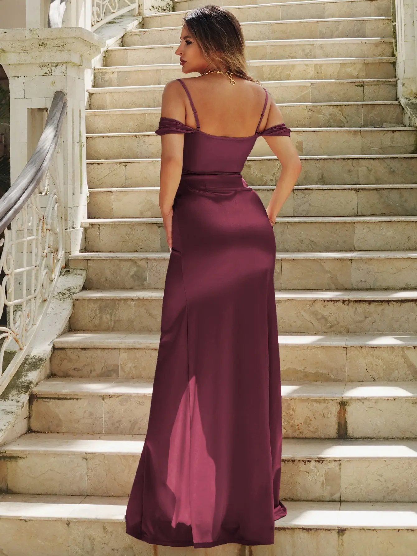 CurvySweet Women's Off Shoulder Pleated Swing Collar Maxi Dress Slim Fit Evening Gown with Side Slit for Formal Events & Cocktail Parties
