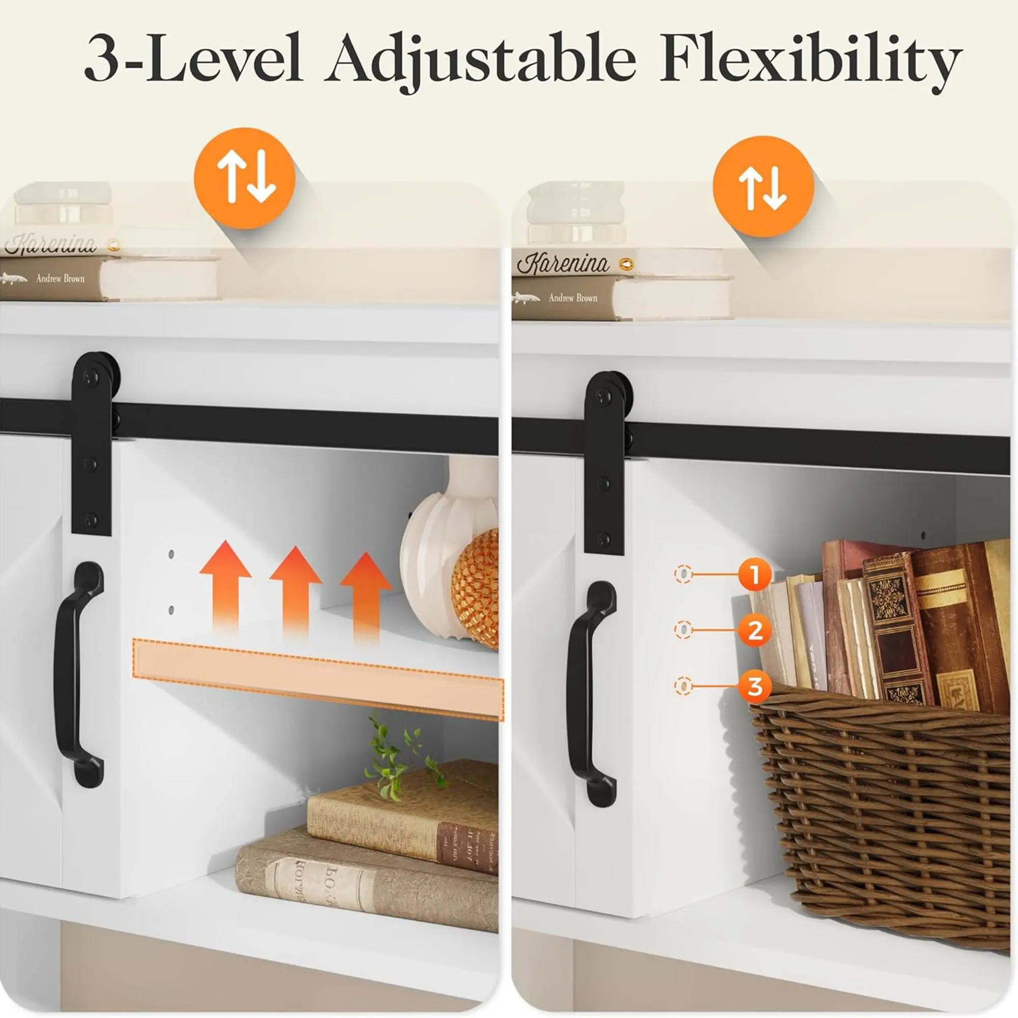Smooth-gliding barn doors add farmhouse flair and functional convenience, letting you conceal or display items as needed
