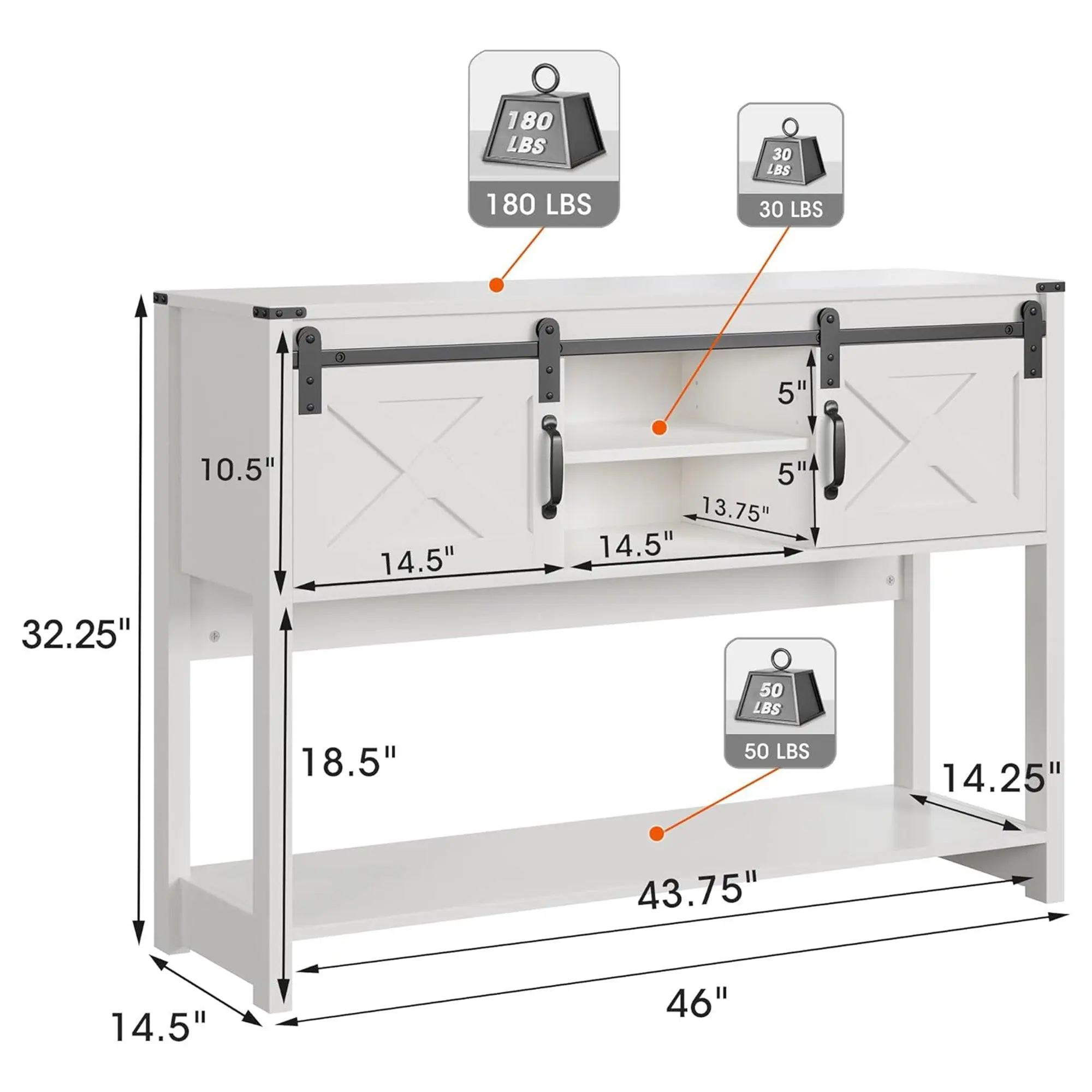Bring warmth, charm, and functionality to your home with the RoyalCraft Farmhouse Entryway Console Table, a versatile piece that blends rustic elegance with practical storage. Highlighted by charming herringbone-patterned barn doors, this table is the perfect companion for your entryway, hallway, living room, or even your home office.Store it all in style with a spacious tabletop designed to showcase your favorite plants, vases, or family photos. Side cabinets provide a tidy hideaway for daily essentials, while the center cubby features a 3-level adjustable shelf to customize your storage. The open bottom shelf adds even more space — perfect for books, baskets, or even a compact coffee machine.Featuring rustic sliding barn doors, this console table combines beauty and convenience. The doors glide smoothly on rails, offering easy access to stored items while doubling as a stylish farmhouse accent. It’s a seamless mix of concealed storage and open display that adapts to your needs.Built strong to last long, this entryway table is crafted from durable P2-grade particleboard and MDF, supporting up to 180 pounds on the tabletop with zero wobble. Reinforced by sleek metal corner accents, it promises both stability and style.From a hallway table to a buffet cabinet, the RoyalCraft console table adapts beautifully to any room. Assembly is simple thanks to clear instructions and included tools, and the waterproof tabletop ensures messes are no match — just wipe clean and enjoy.Elevate your space with farmhouse charm and everyday functionality.