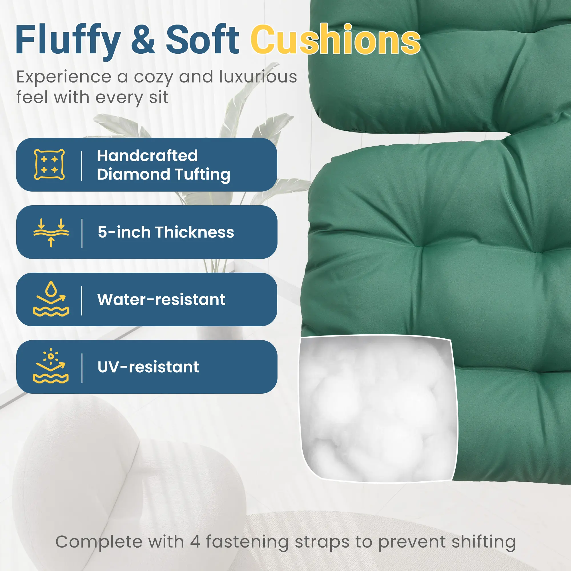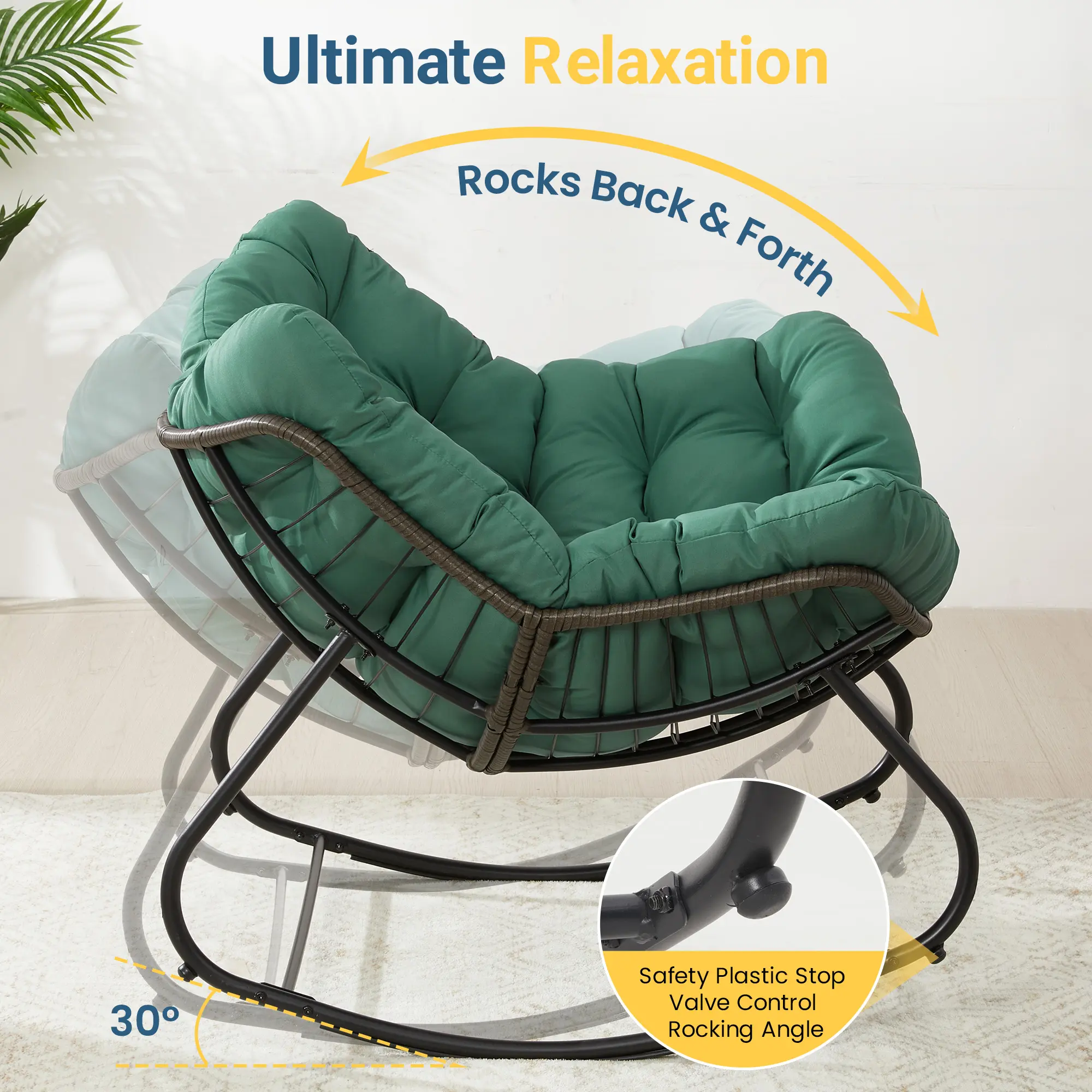 Relax in style with our egg-shaped outdoor rocking chair, designed for ultimate comfort. The plush 5-inch cushion and matching ottoman offer support, while the smooth 30-degree rocking motion soothes you. Whether you're reading a book on the balcony, enjoying a sunny afternoon in the backyard, or unwinding in the garden, this chair provides a perfect spot to relax. Made with tough PE wicker and a strong iron frame, it's built to withstand the outdoors. Ideal for year-round use, it adds comfort and elegance to any space. Easy to assemble and maintain, it’s your perfect leisure companion.