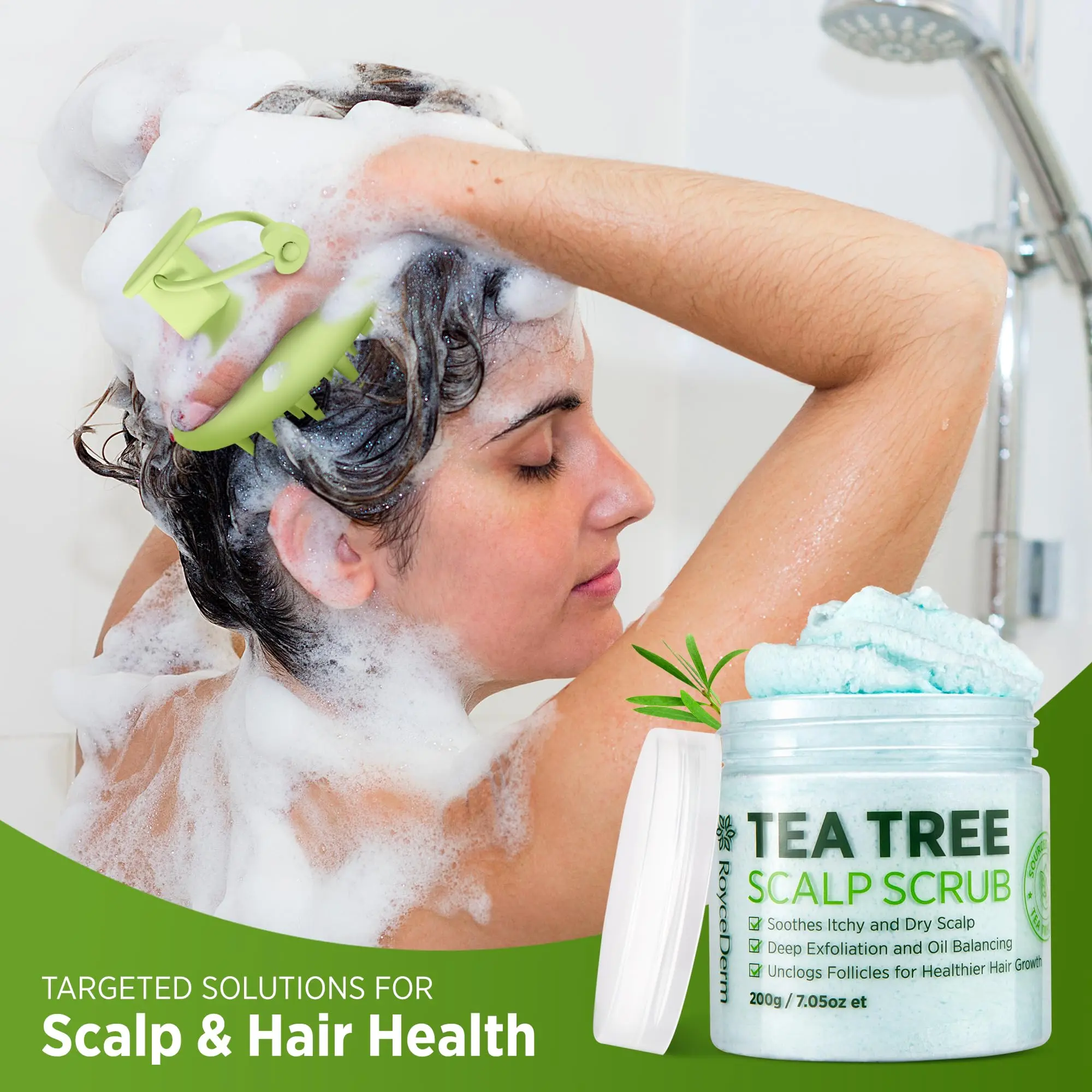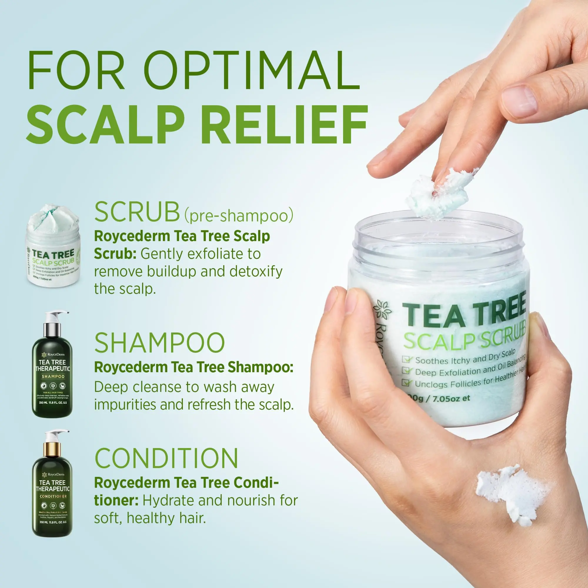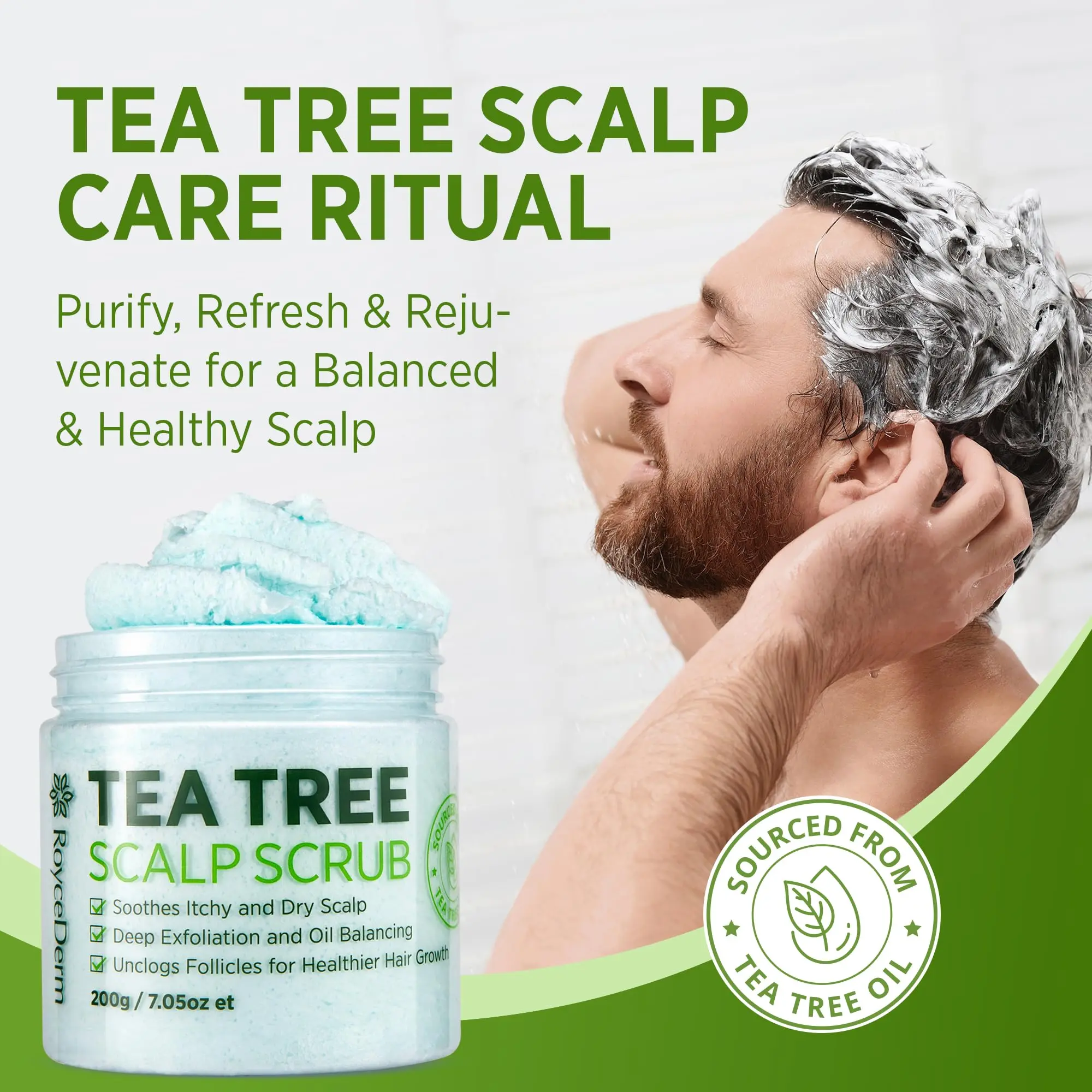 SOOTHES ITCHY SCALP & DANDRUFF - Roycederm Tea Tree Scalp Scrub with tea tree oil, Shea Butter, and Witch Hazel helps relieve itchy scalp, dandruff. This scalp treatment exfoliator removes buildup, flakes, and excess oil for a healthier, refreshed scalp.