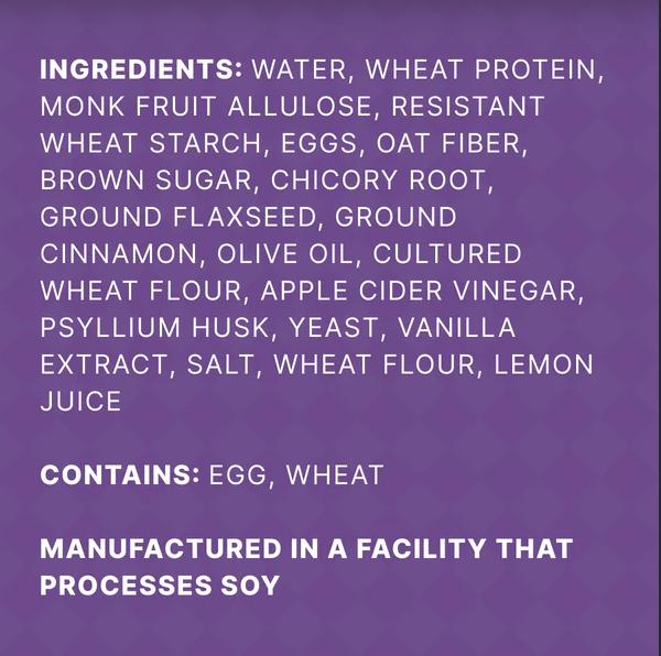 Water, wheat protein, monk fruit allulose, resistant wheat starch, eggs, oat fiber, brown sugar, chicory root, ground flaxseed, ground cinnamon, olive oil, cultured wheat flour, apple cider vinegar, psyllium husk, yeast, vanilla extract, salt, wheat flour, lemon juice.