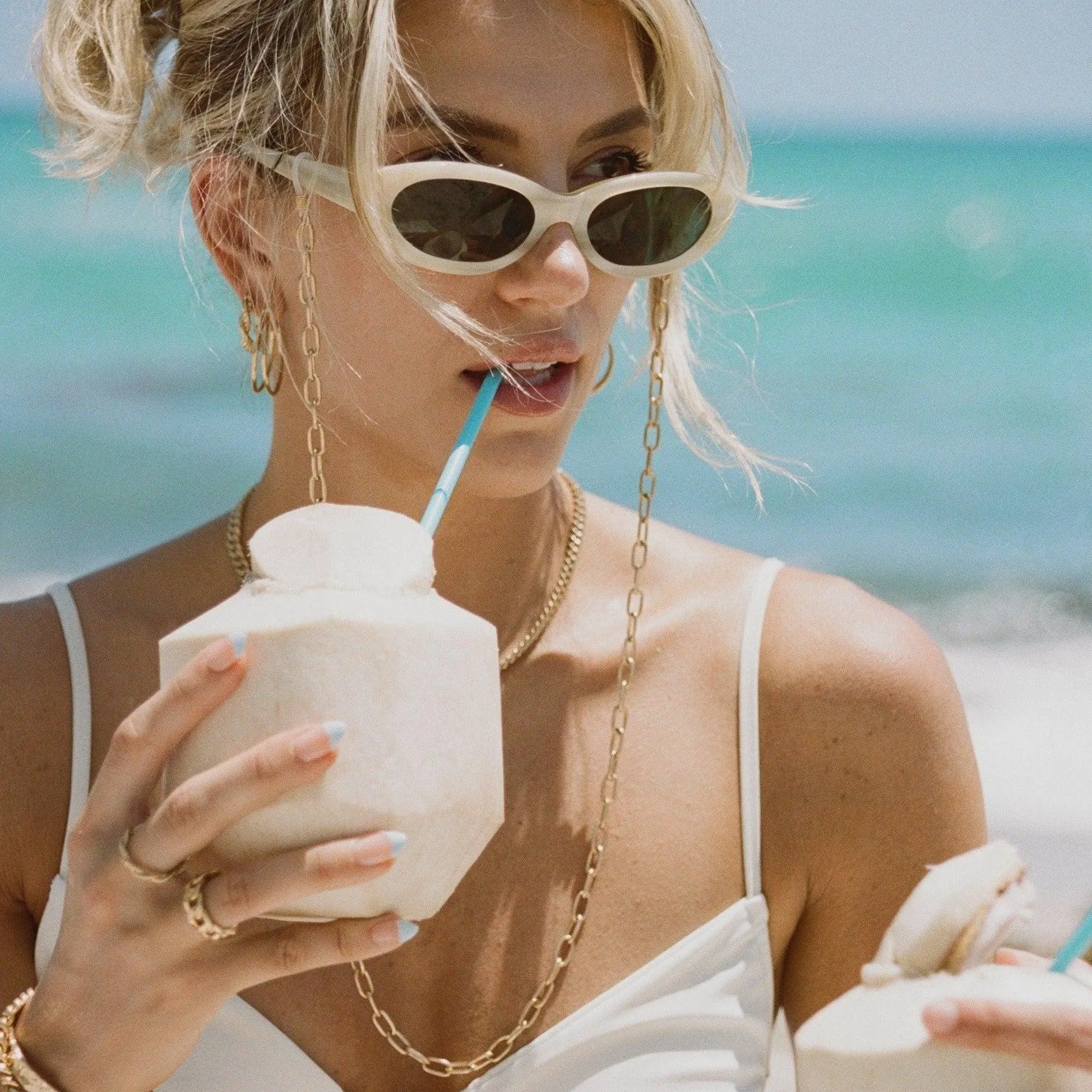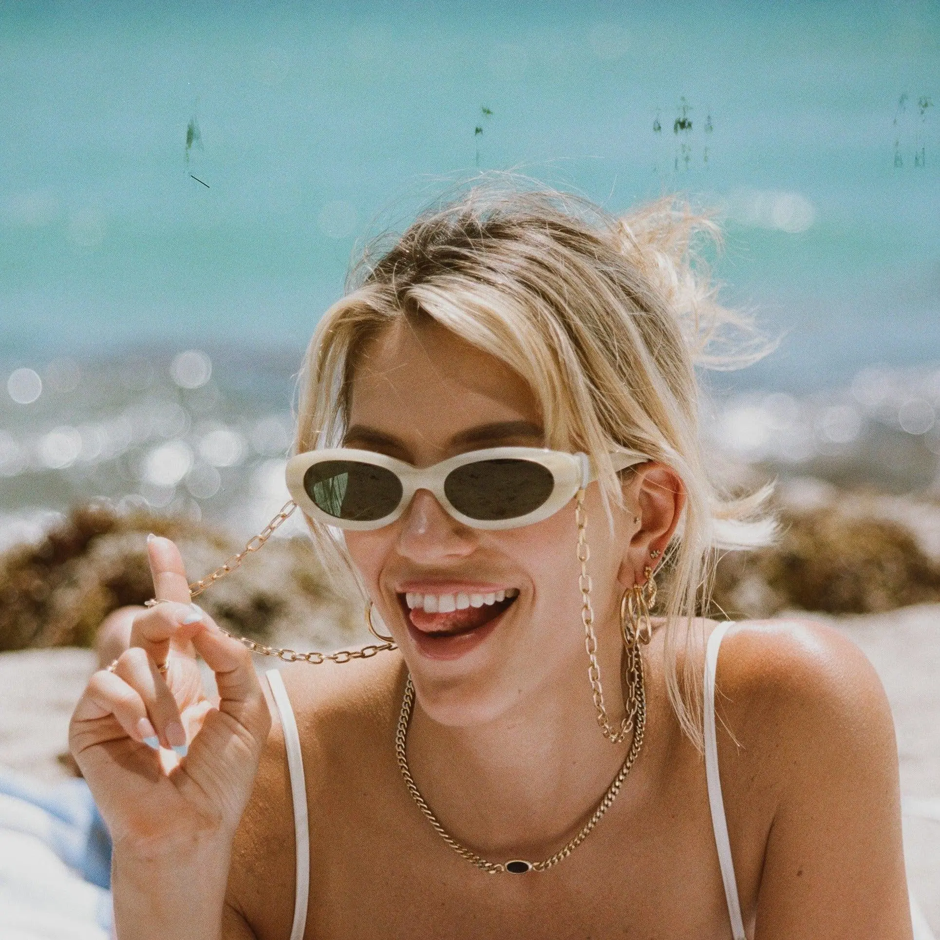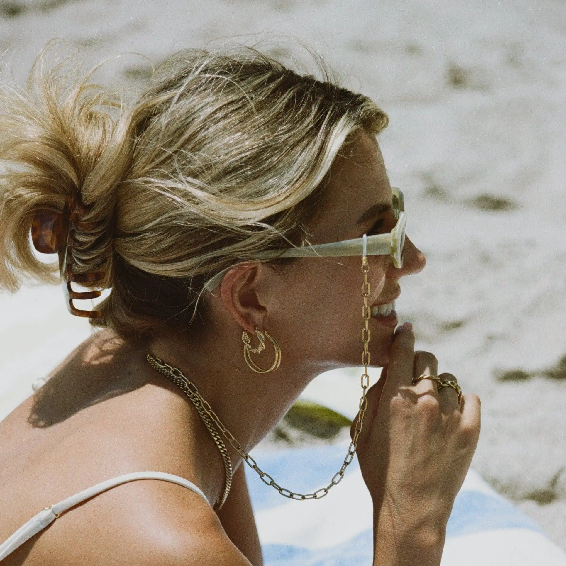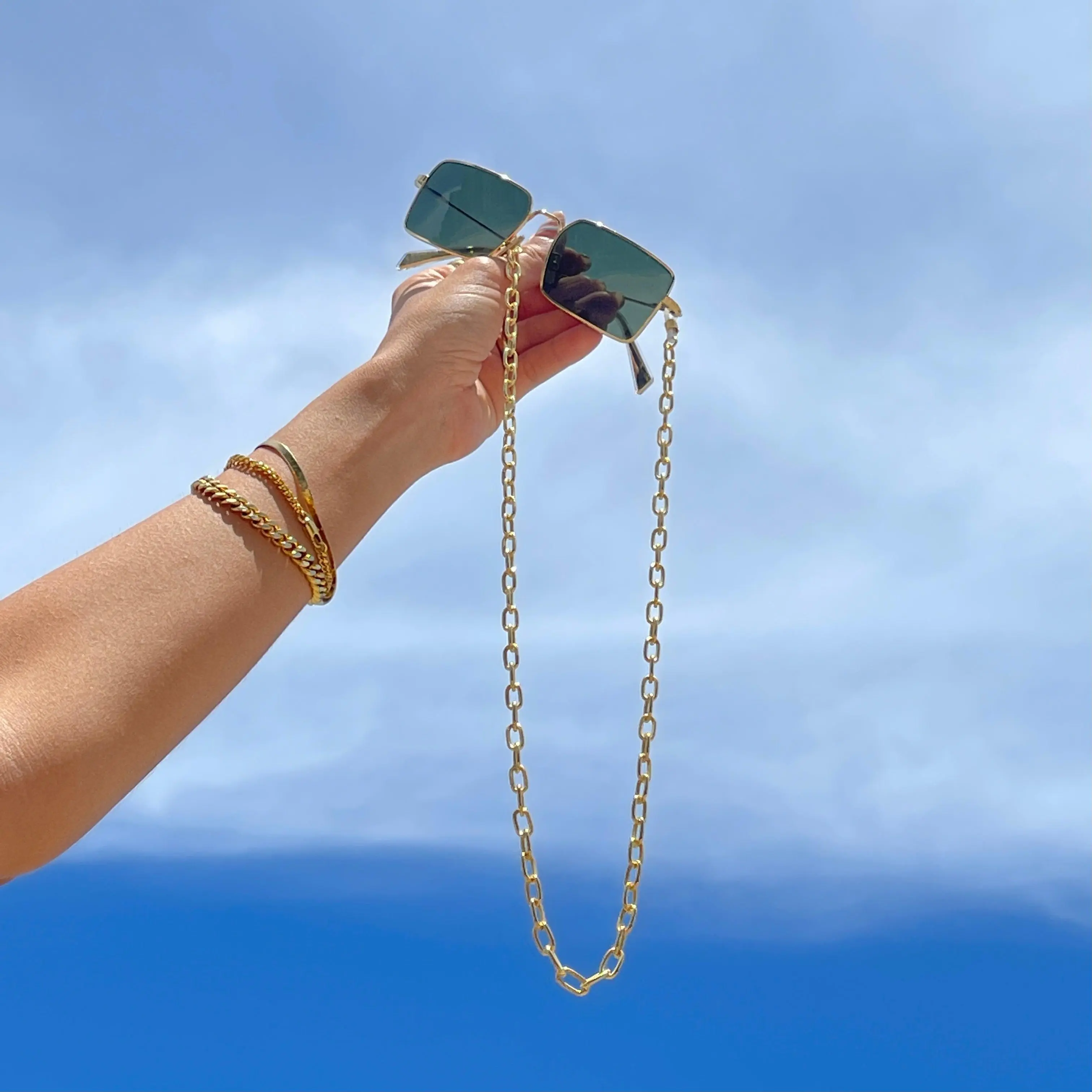 Sunglass chains are here!  This simple cable chain design is the perfect compliment to your favorite pair of sunnies this summer.