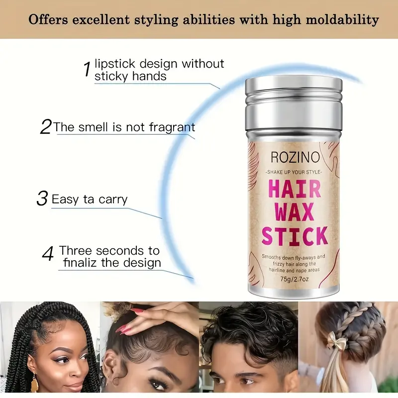 The Rozino Hair Wax Stick is designed for smooth fly-aways and frizzy hair. It targets hairline and nape areas effectively. With a weight of 75g/2.7oz, this wax stick provides the right amount of control for your hair needs. Ideal for managing hair for a sleek and polished look.