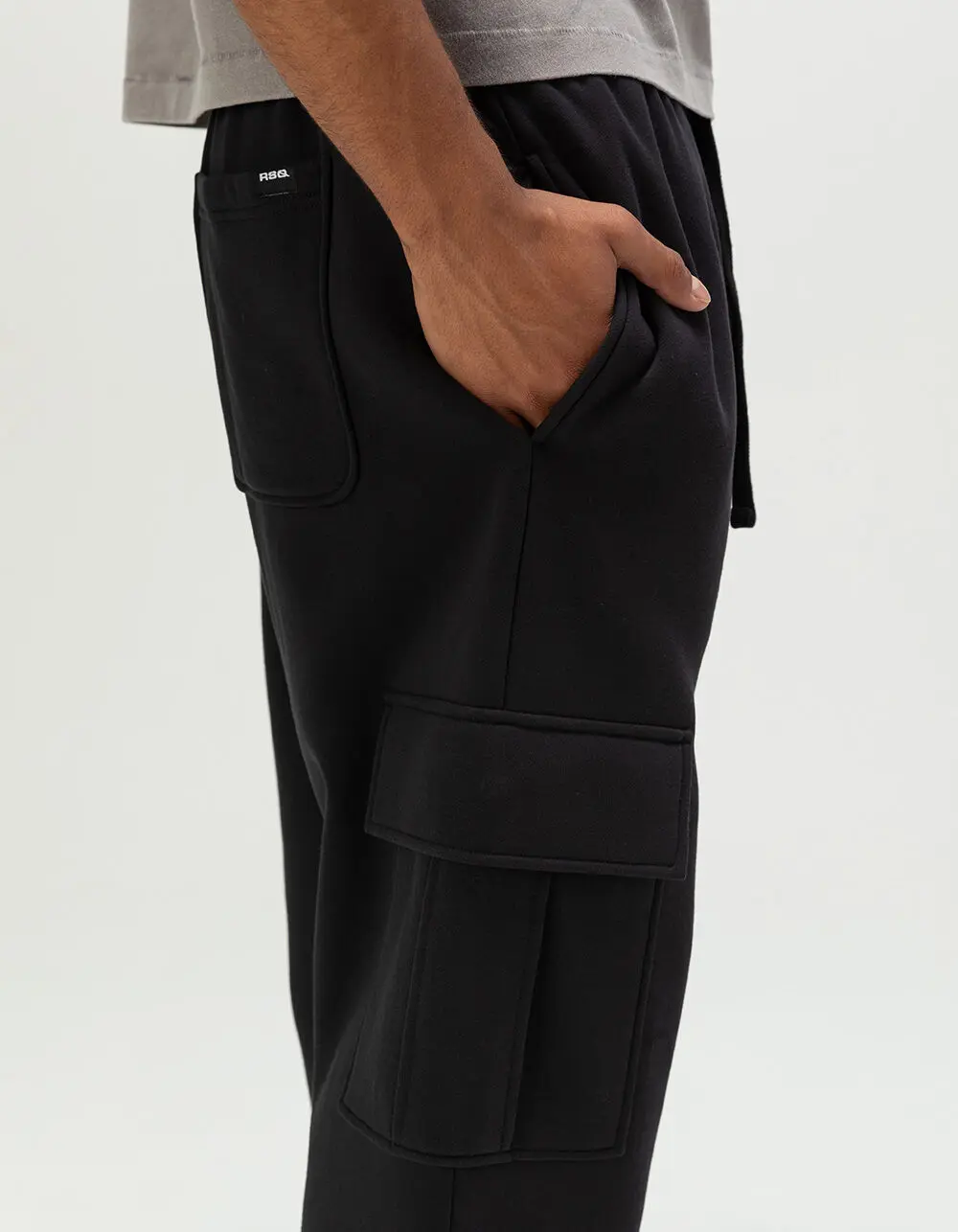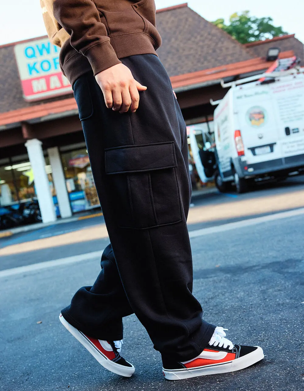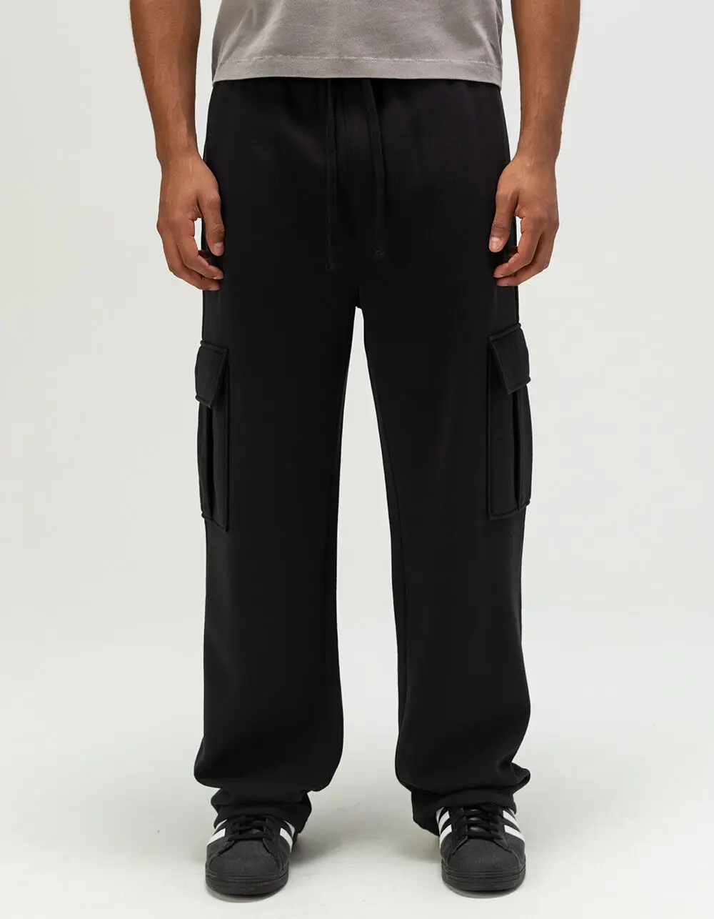 RSQ Baggy Cargo Sweatpants. Elastic waistband with drawstring. Side seam pockets. Cargo pockets with flap closures on each leg. Back right pocket. Woven label on back pocket. Baggy fit. Fleece lining. 60% Cotton 40% Polyester. Machine wash. Imported.