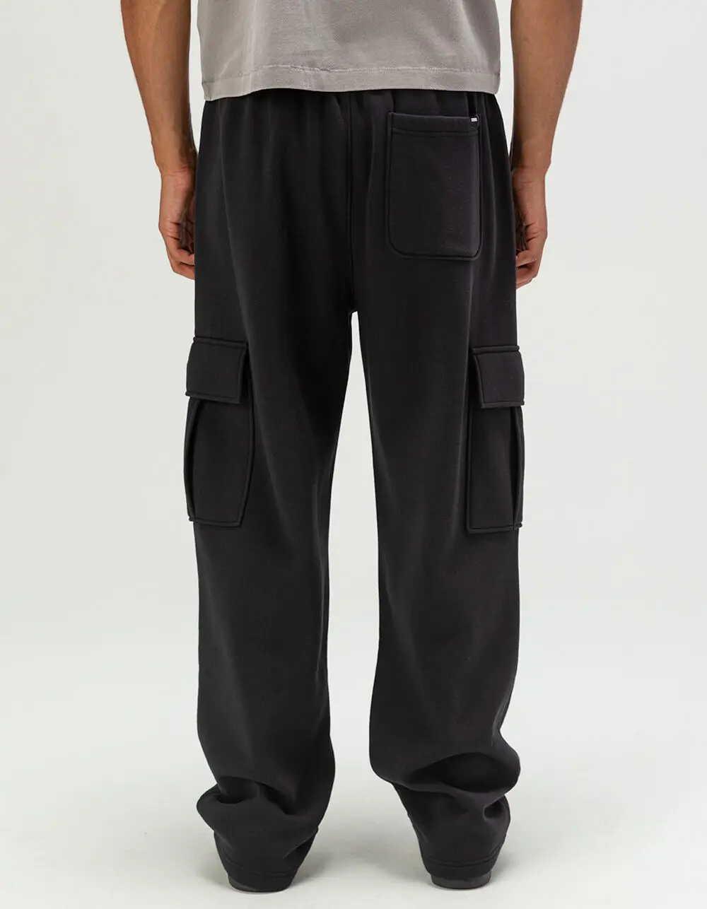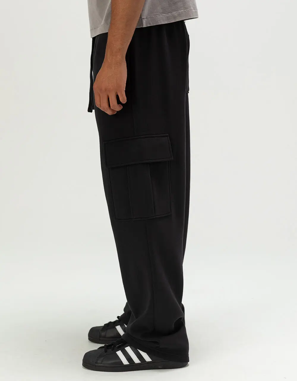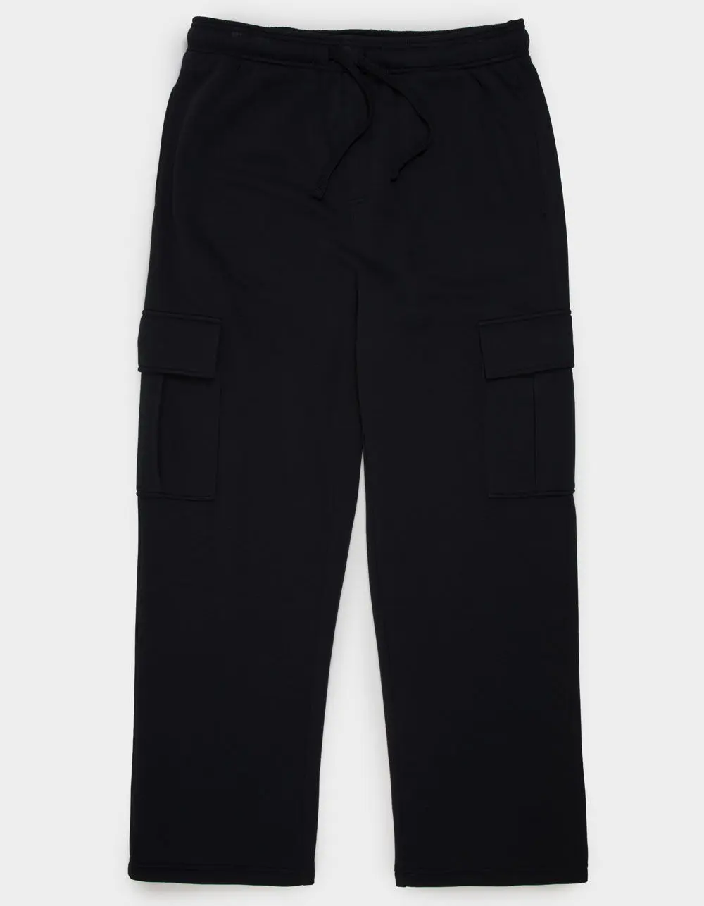 RSQ Baggy Cargo Sweatpants. Elastic waistband with drawstring. Side seam pockets. Cargo pockets with flap closures on each leg. Back right pocket. Woven label on back pocket. Baggy fit. Fleece lining. 60% Cotton 40% Polyester. Machine wash. Imported.