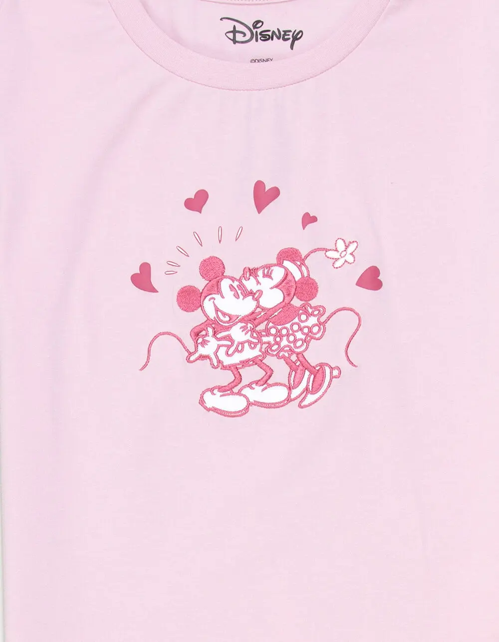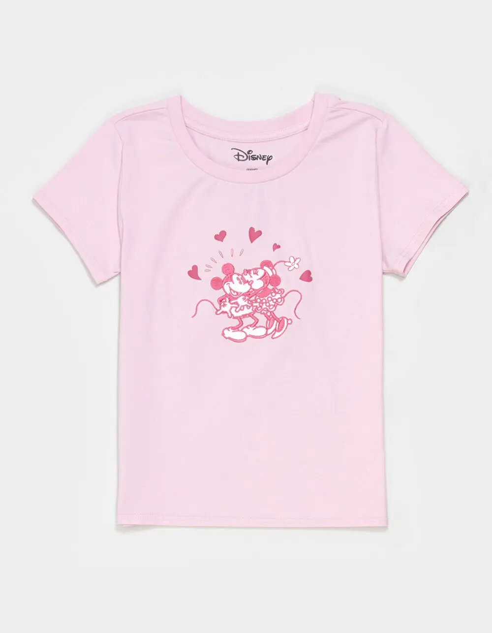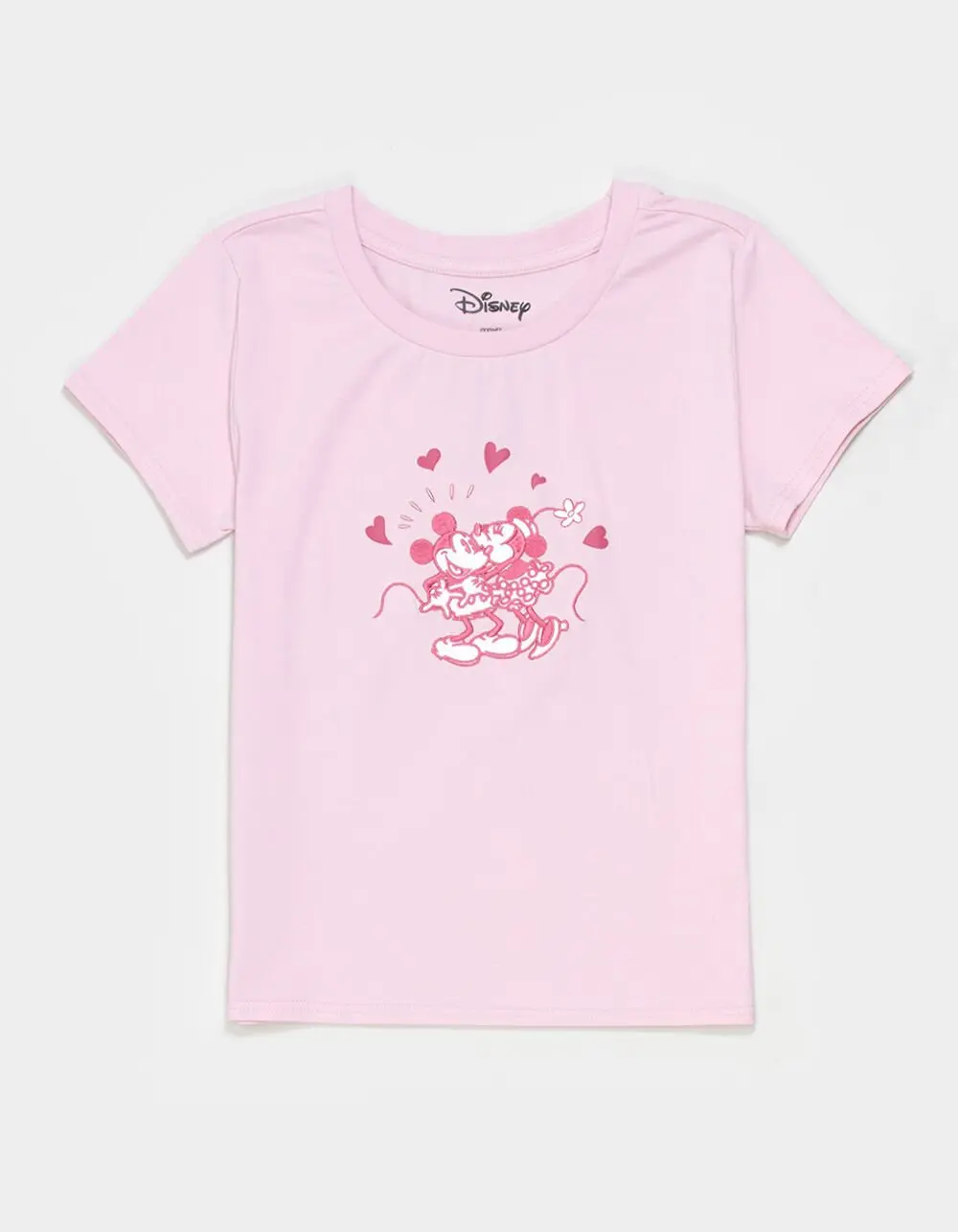 RSQ Disney Minnie Mouse Baby Tee. The RSQ Disney Minnie Mouse Baby Tee adds a sweet, playful touch to your everyday style. This pink tee features an embroidered graphic of Minnie Mouse giving Mickey Mouse a kiss, with little hearts floating above them for an extra-cute finish. Designed in a baby tee silhouette with a classic crew neckline and short sleeves, it offers a clean, charming look that’s easy to wear on its own or layered under jackets and cardigans. It’s the perfect blend of nostalgic Disney detail and modern, fun fashion. 95% Cotton 5% Spandex. Machine wash. Imported.