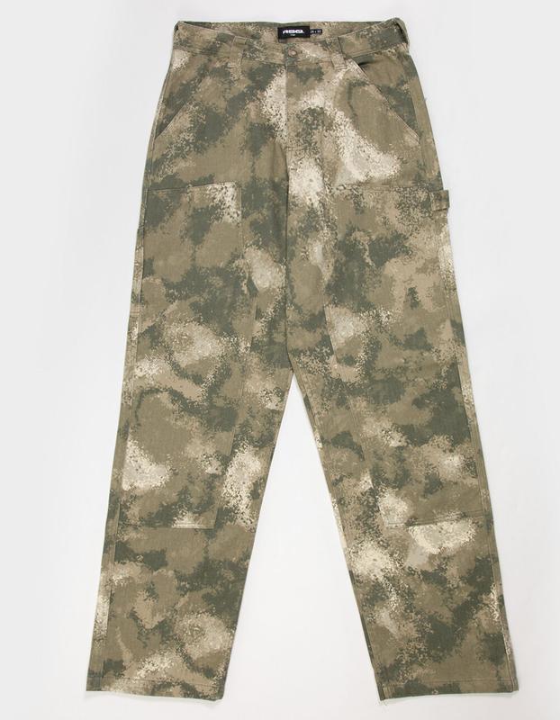 RSQ Baggy Utility Pants. Allover camo pattern. Slant pockets. Dual back pockets. Hammer loop at left leg. Utility pockets at right leg. Reinforced knee panels. Button closure with zip fly. Belt loop waist. Baggy fit. Approximate leg opening: 18in. 100% Cotton. Machine wash. Imported.