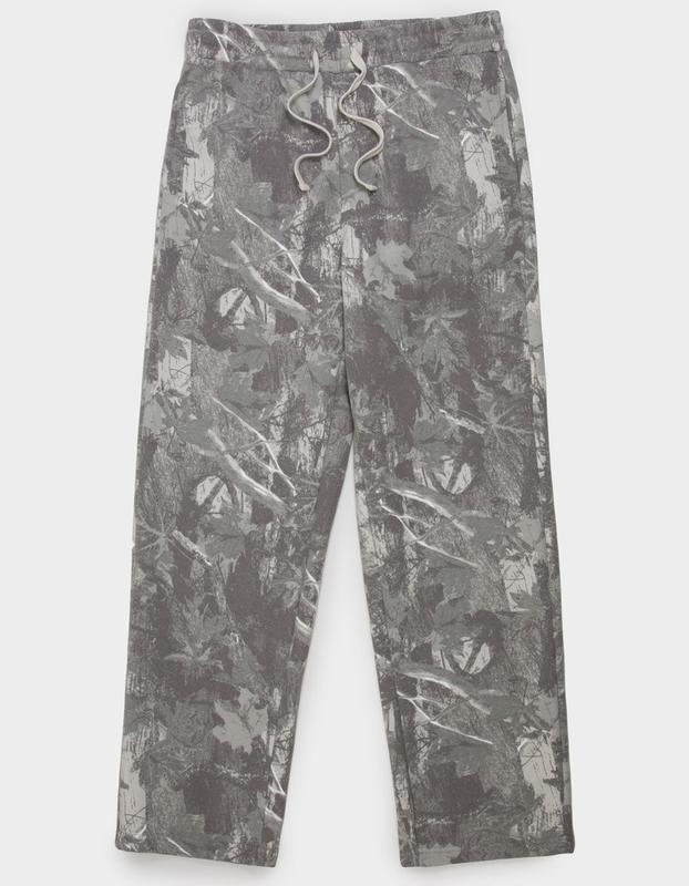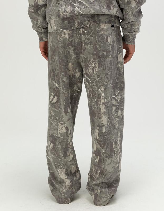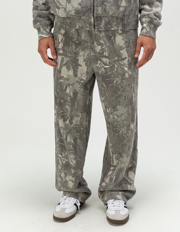 RSQ Baggy Sweatpants. The RSQ Baggy Sweatpants for men in an allover woodland camo pattern bring rugged, street-ready style to casual comfort. Featuring a relaxed baggy fit and soft fleece lining, these sweatpants provide cozy wearability and easy movement. An elastic waistband with drawstring ensures a secure, adjustable fit, while functional side seam pockets and a back right pocket offer convenient storage. Perfect for lounging, layering, or making a bold casual statement, these camo sweatpants combine practicality with standout style. 57% Polyester 43% Cotton. Machine wash. Imported.
