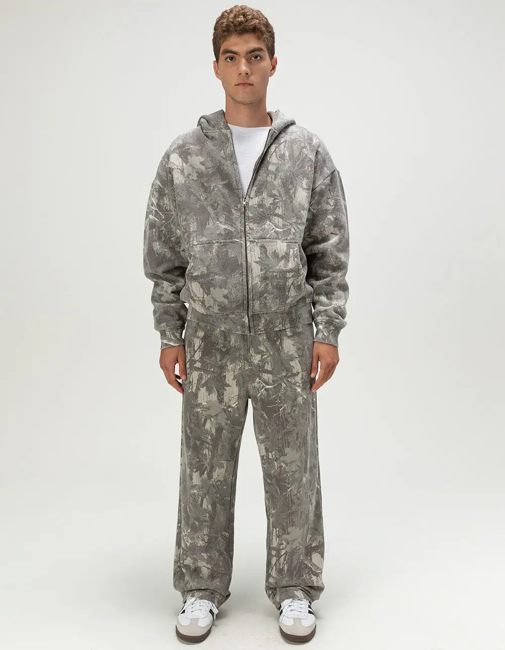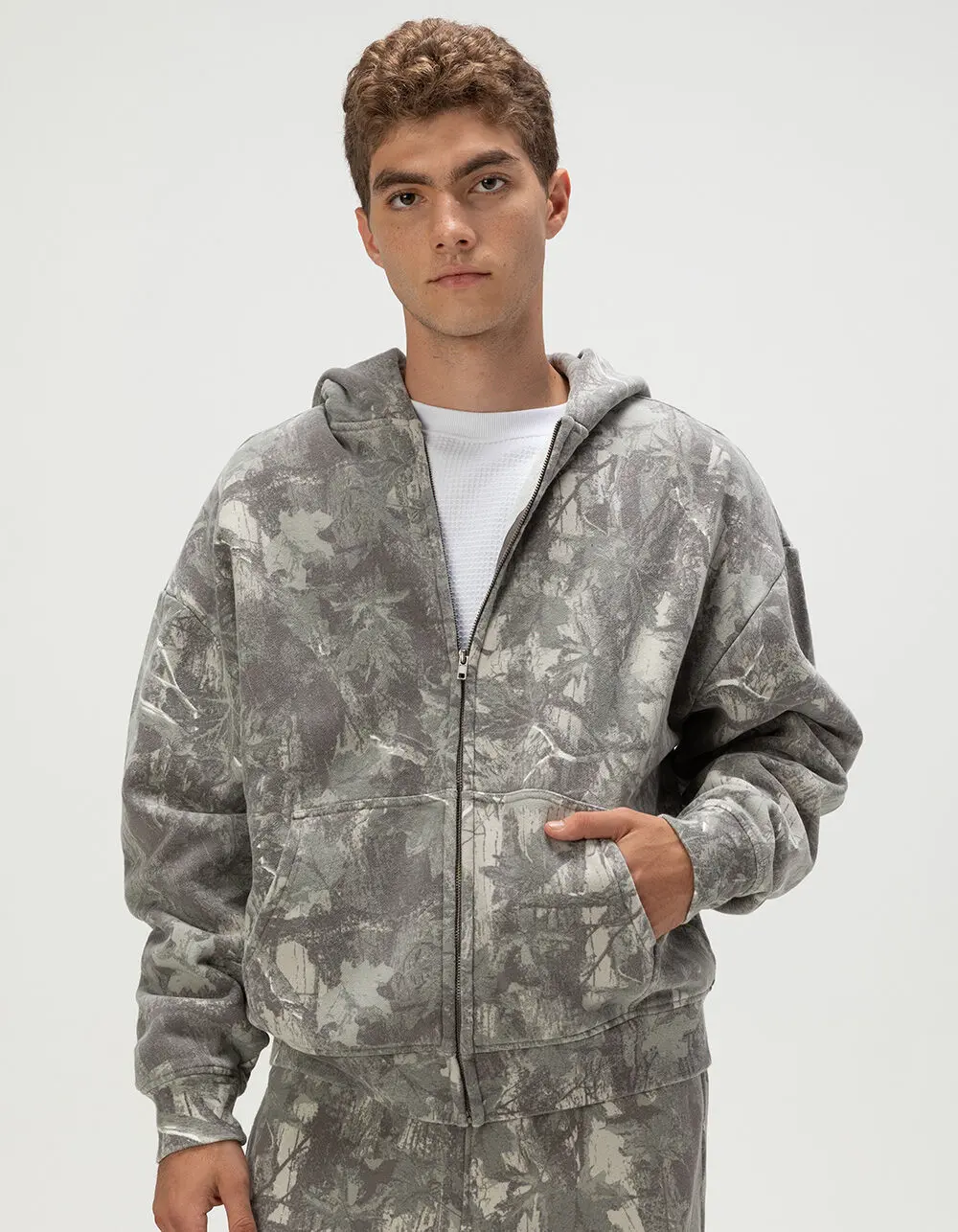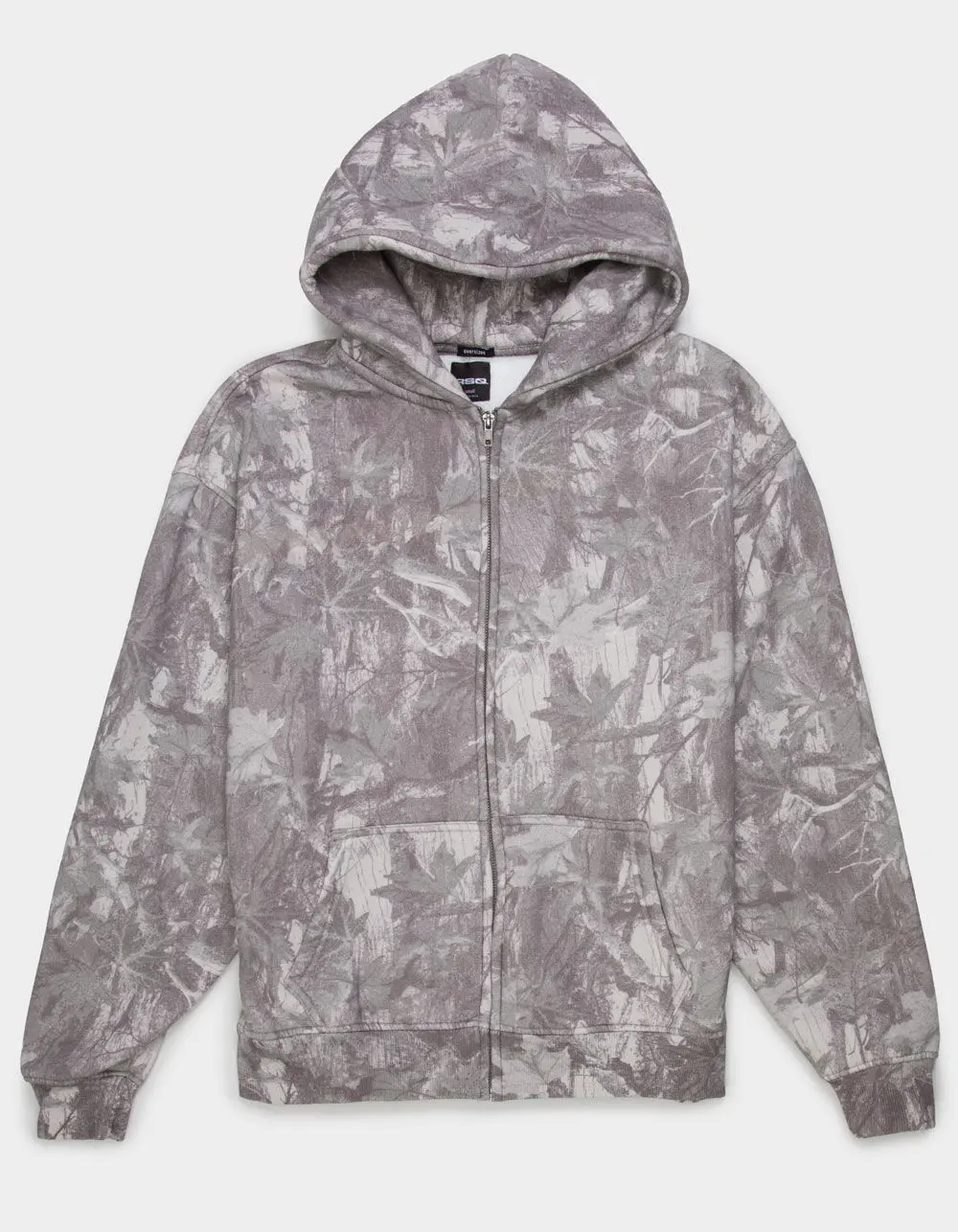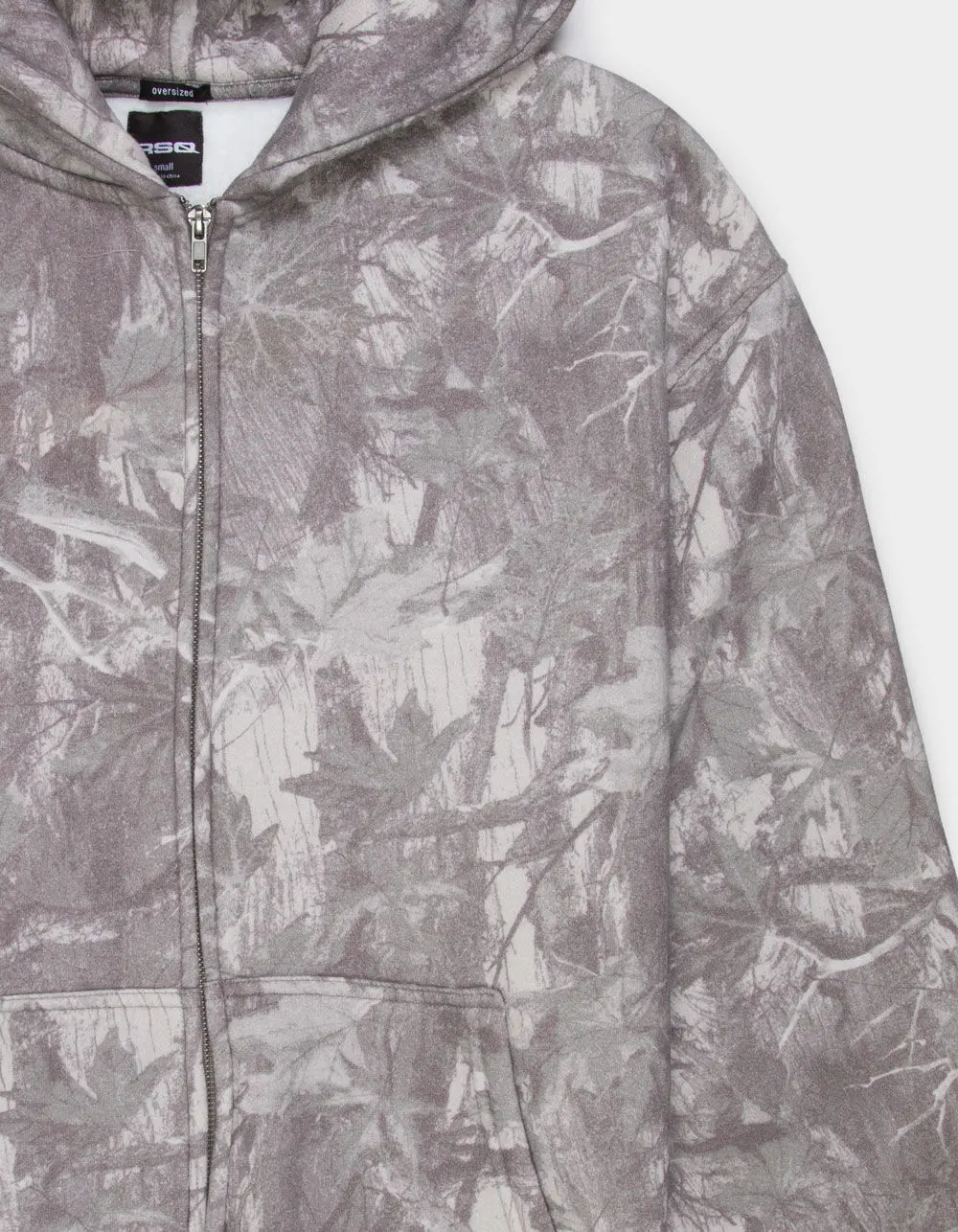 RSQ Oversized Zip-Up Hoodie. Allover woodland camo pattern. Zip-up front closure. Front pockets. Fixed hood. Fleece lining. Cuffed long sleeves and hem. Oversized fit. 57% Cotton 43% Polyester. Machine wash. Imported.