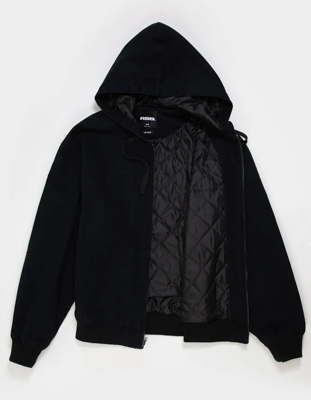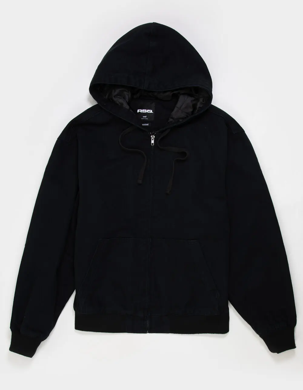 RSQ Oversized Hooded Twill Jacket. The RSQ Oversized Hooded Twill Jacket for men blends casual comfort with utilitarian style. Designed with an oversized fit, this solid-color jacket offers a relaxed, street-ready silhouette that’s perfect for layering. Crafted from durable twill fabric, it features a quilted lining for added warmth and comfort. Front pockets provide convenient storage, while the drawstring hood adds versatility for changing weather. Finished with elastic ribbed cuffs and hem for a secure, comfortable fit, this jacket delivers effortless everyday style with a modern edge. 100% Cotton. 100% Polyester lining. Machine wash. Imported.