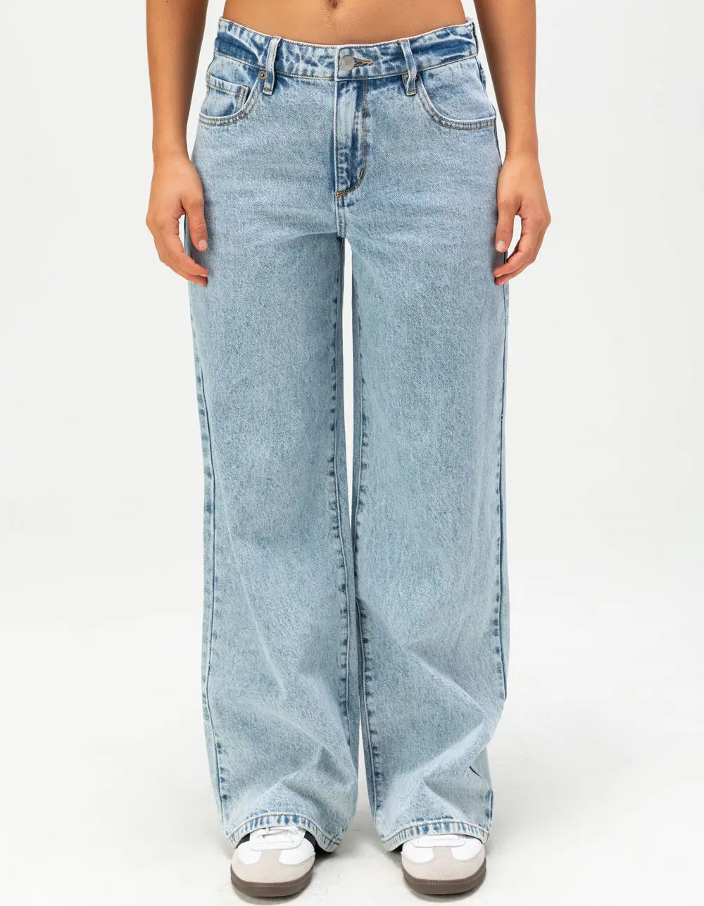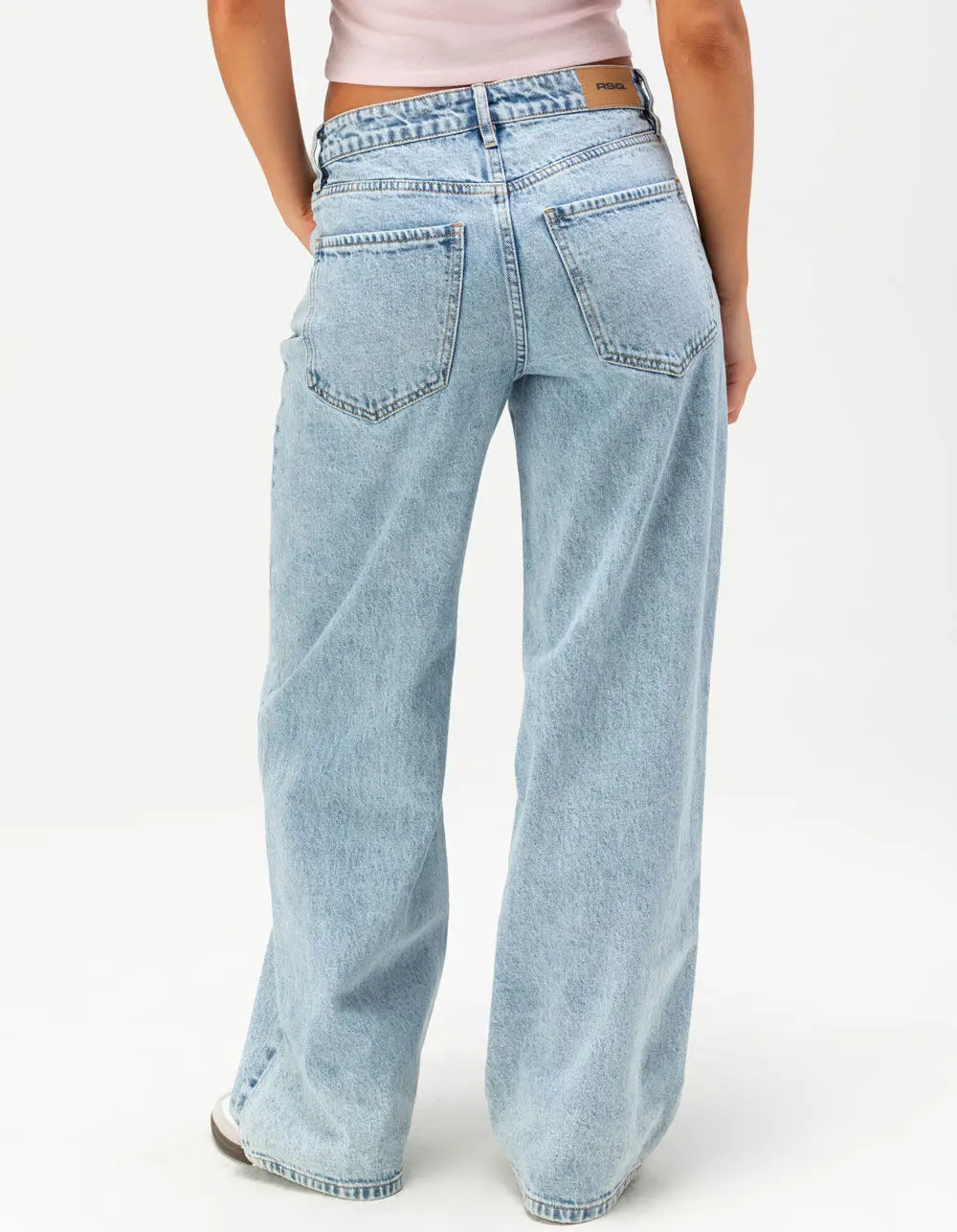 RSQ High Rise Baggy Jeans. 5-pocket denim styling. Belt loop waist. Button closure paired with zipper fly. High rise. Baggy fit. Approximate leg opening: 20in. Approximate inseam: 30in. 94% Cotton 6% Other Fibers. Machine wash. Imported. Model is wearing a size 25. Model measurements:Height: 5’9” Bust: 32”Waist: 25”Hips: 35”