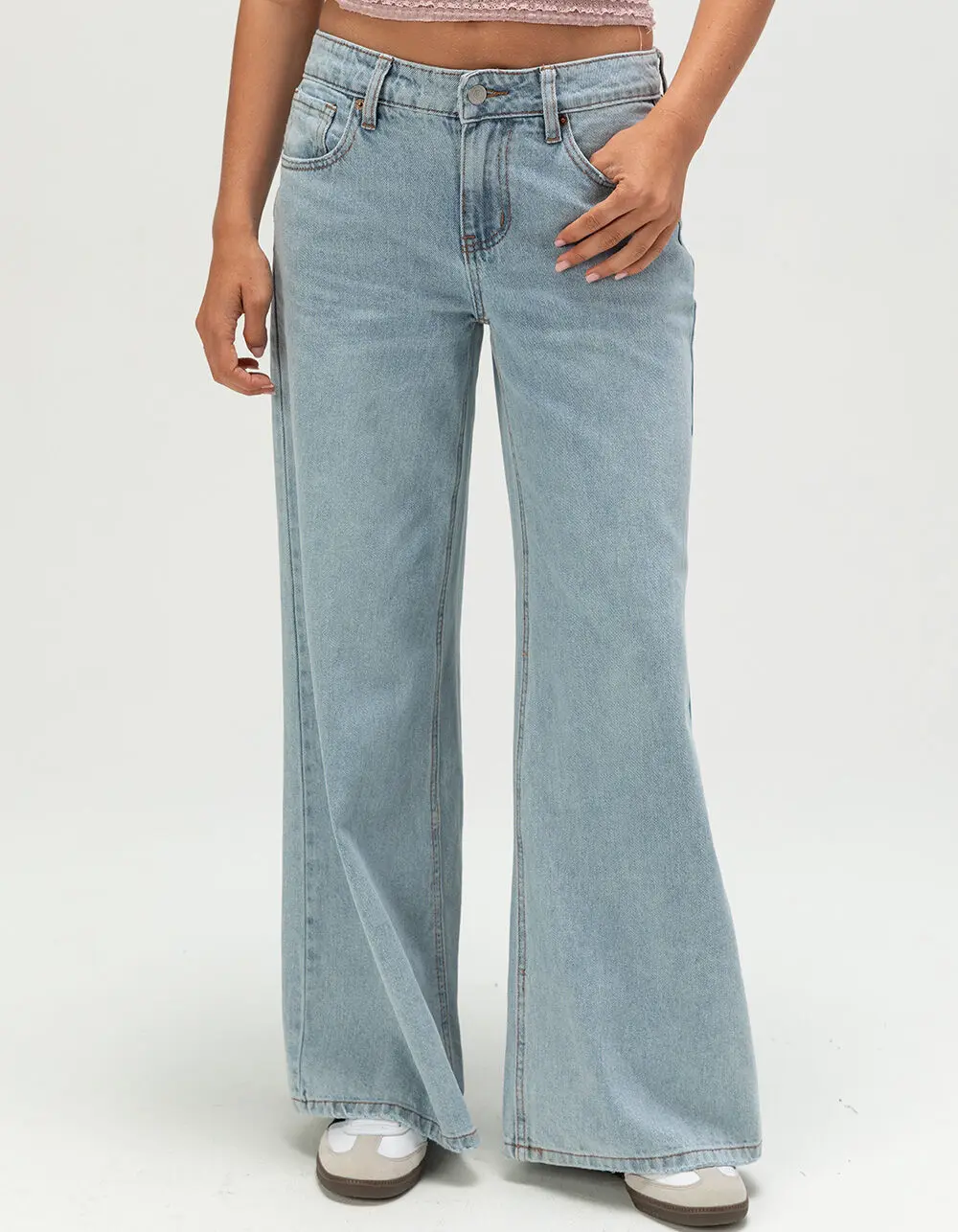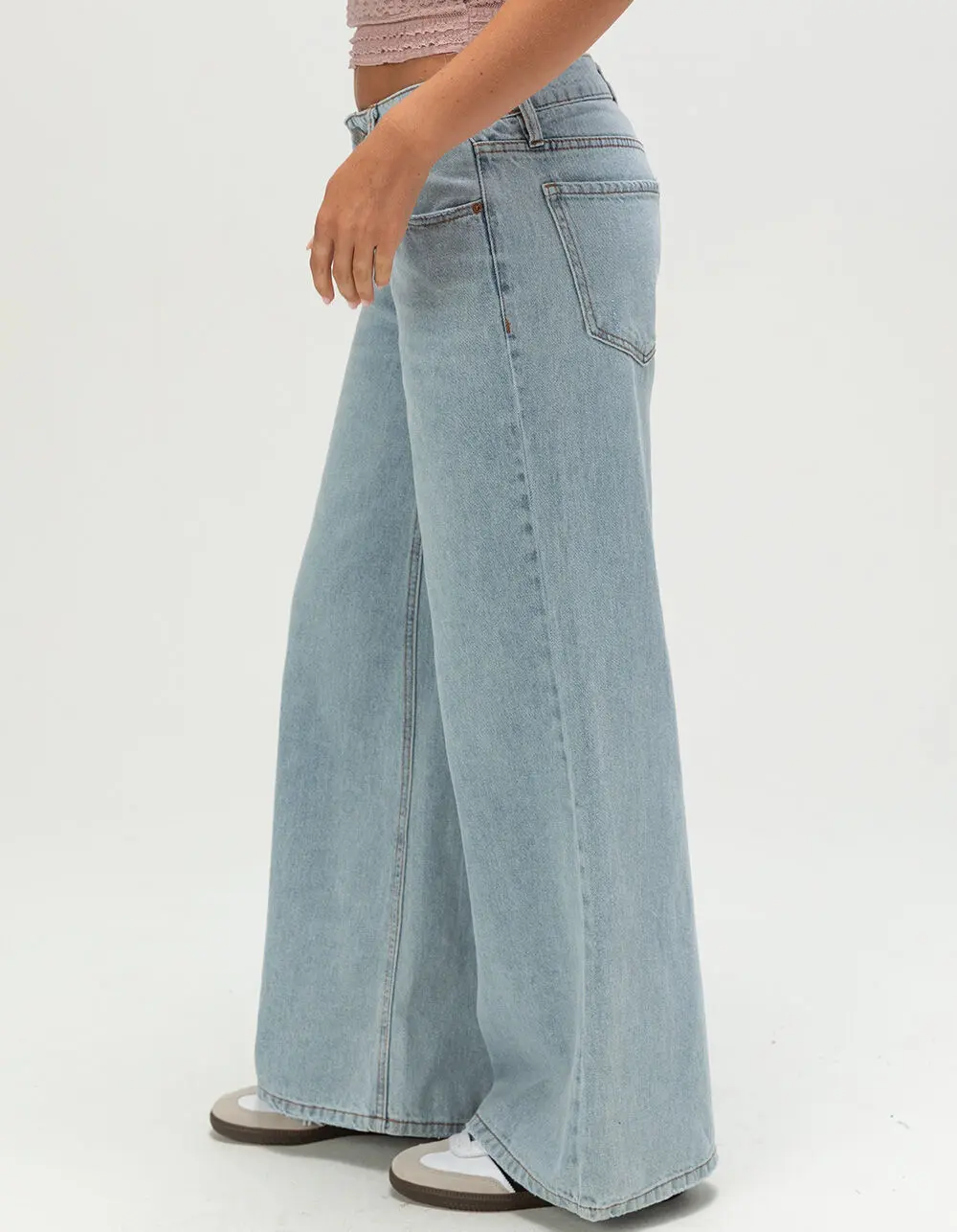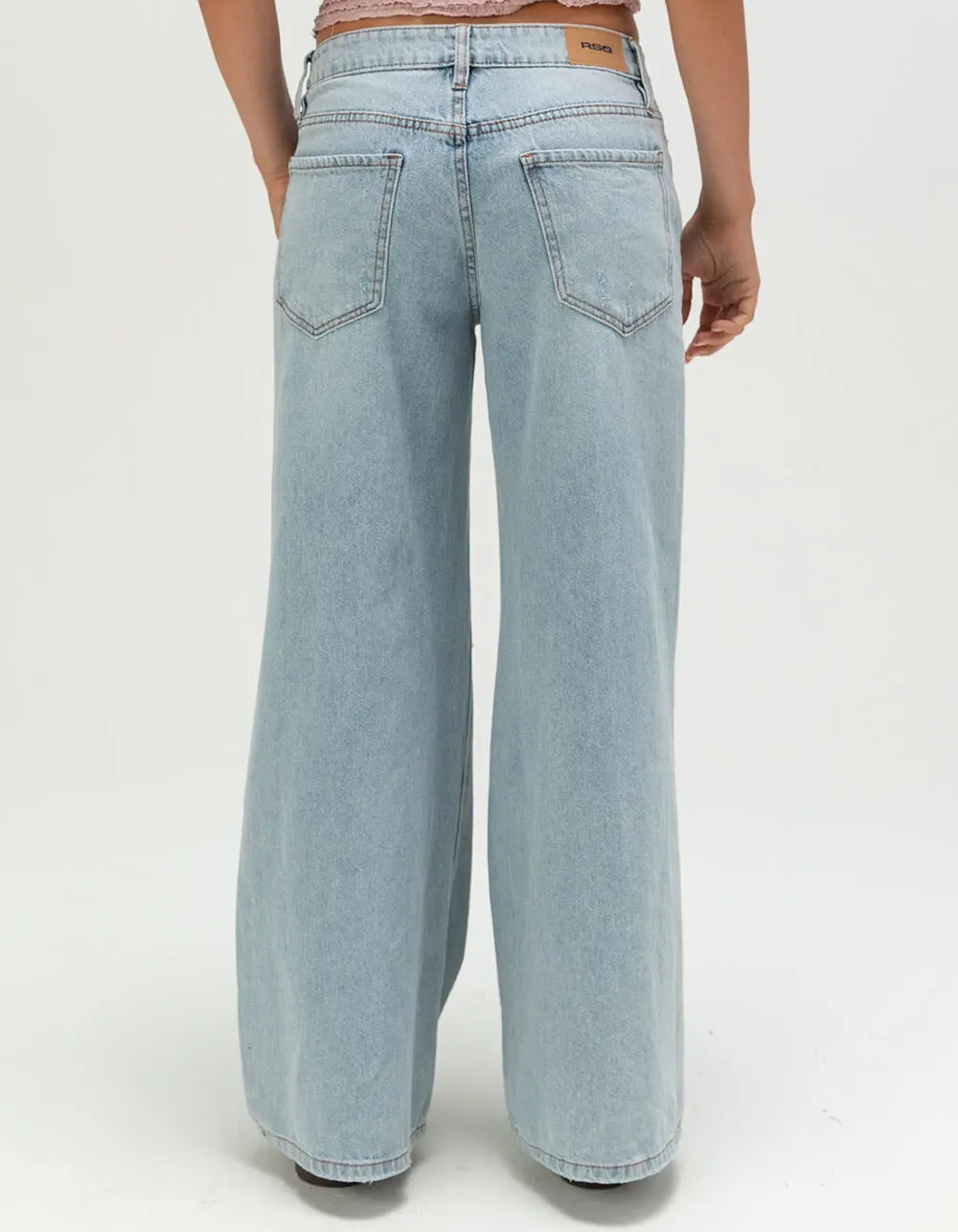 RSQ Womens Low Rise Baggy Jeans. 5-pocket denim styling. Button closure with zip fly. Belt loop waist. Low rise. Baggy fit. Comfort and style. Slight distressing on front pockets and leg openings. Light wash. Approximate leg opening: 24in. 94% cotton 6% other fibers. Machine wash. Imported. Model is wearing a size 26. Model measurements:Height: 5’8” Bust: 32”Waist: 25”Hips: 34”