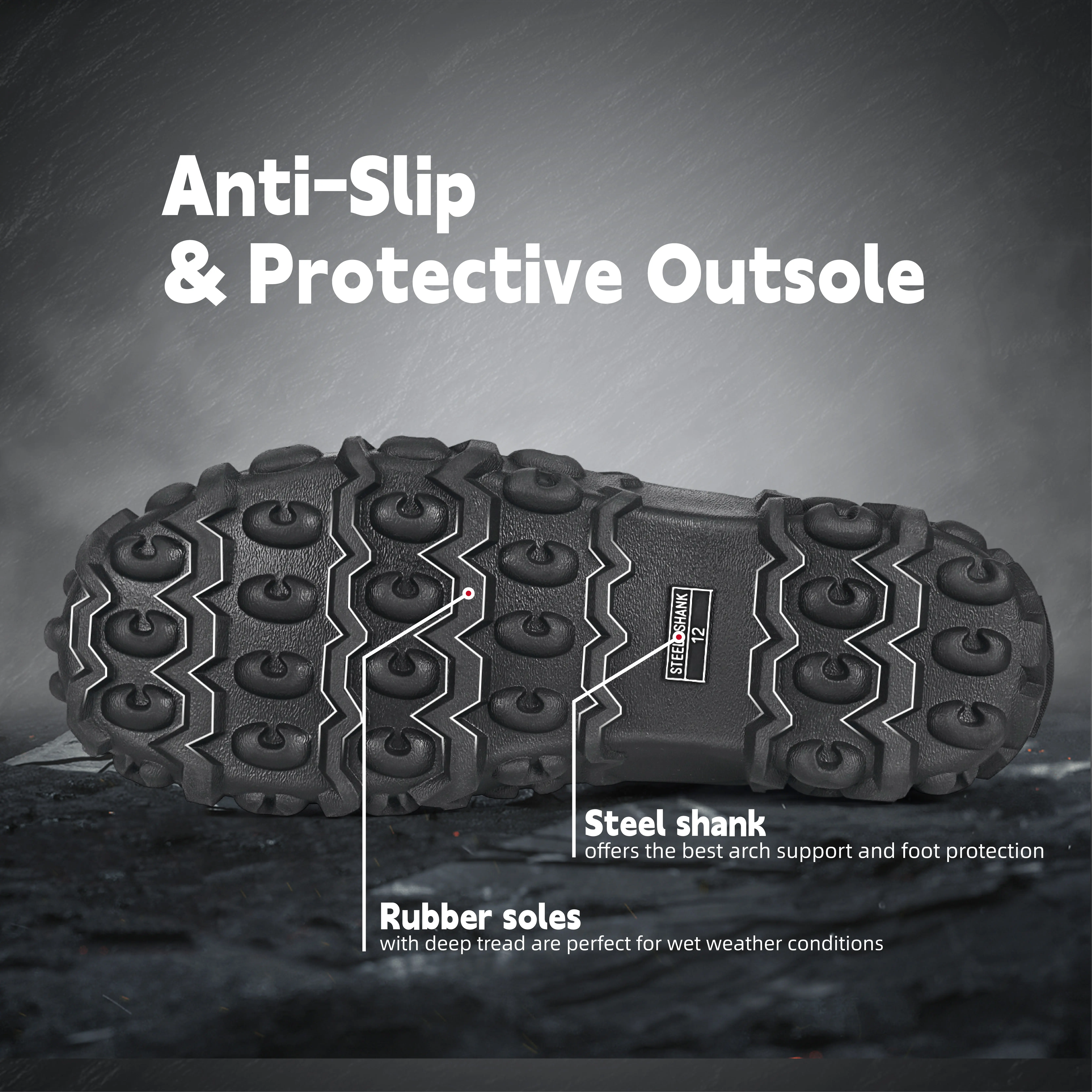 【Steel Shank】The bottom of the RRUDAVE rubber work boots is equipped with a rectangular steel handle that has good puncture resistance, ensuring stable support for the arch of the foot while protecting the feet, keeping them away from injury.