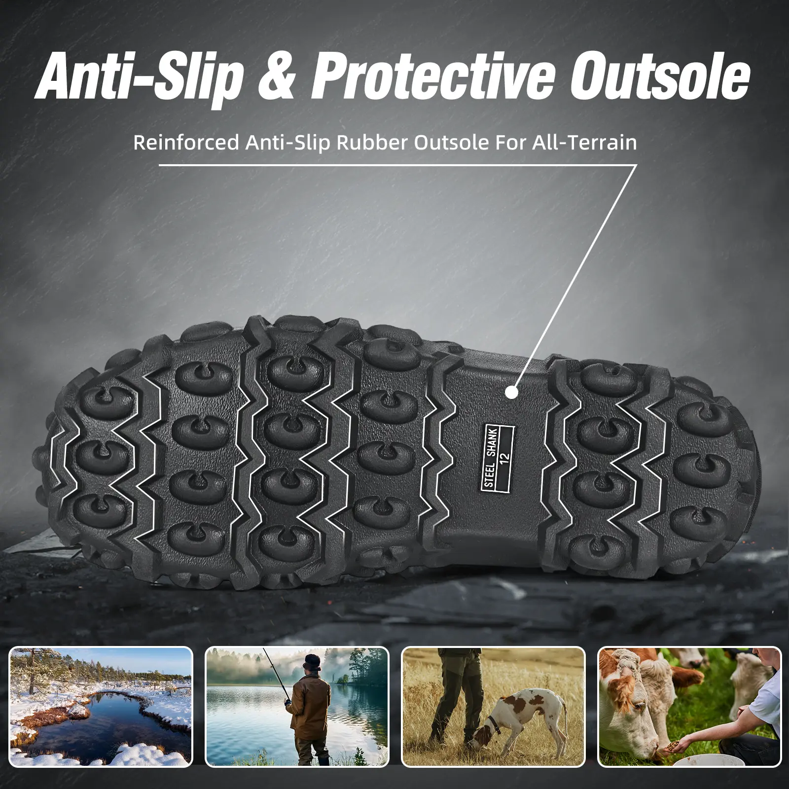【Waterproof & Anti-Slip】The rubber boots are made of 100% waterproof rubber and neoprene materials, keeping feet dry and comfortable during work. Deep tread rubber sole for strong grip and easy control over any terrain.