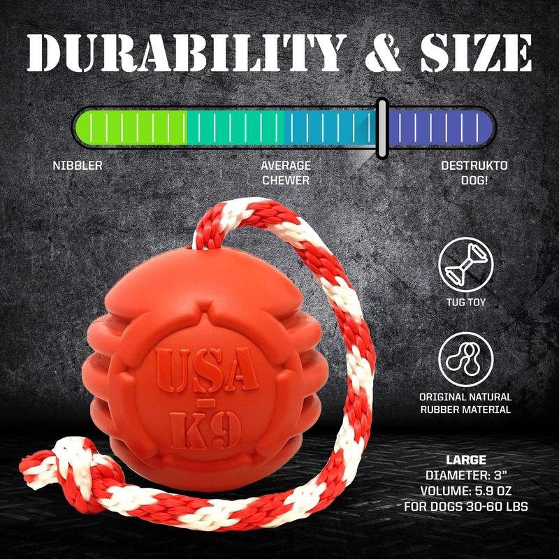 The USA-K9 Stars and Stripes Ultra-Durable Durable Rubber Chew Toy is a versatile toy for large dogs, designed to reduce problem behaviors and promote dental health. Made from natural, FDA compliant materials, it is safe, easy to clean, and approved by veterinarians. With a 30-day replacement guarantee, it is a reliable choice for dog owners.