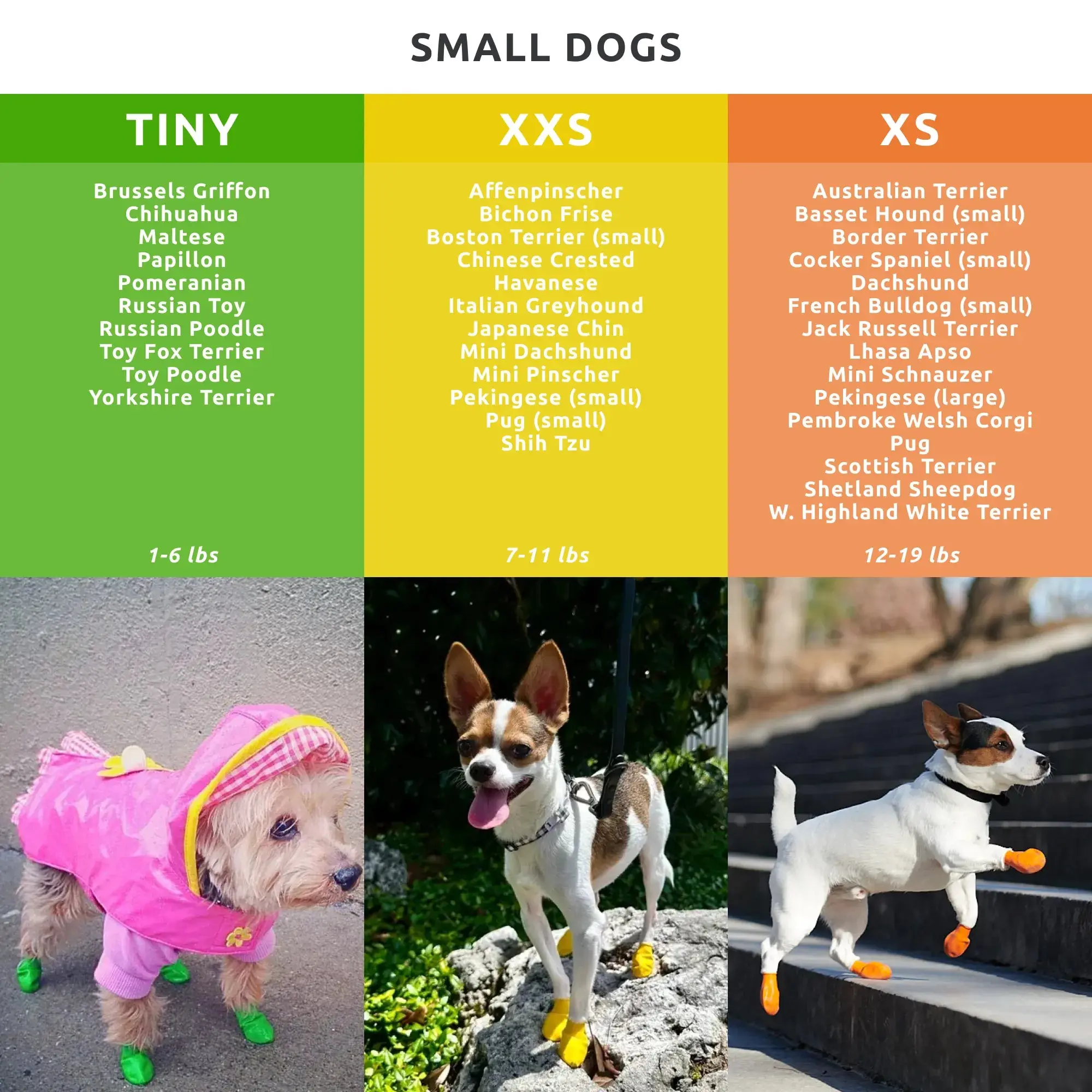 Just purchased these absolutely Wonderful Rubber Boots for my Oliver (25 lbs. Cavachon) he loves to walk everywhere the woods bike trails he’s always game for a new adventure. But when his little feet become packed with ice/ snow the excitement ends quickly. These are perfect he had no adjustment getting use to them they fit perfect( we got size small) there’s no stopping him now! Life is good Thank you for such a perfect boot!
