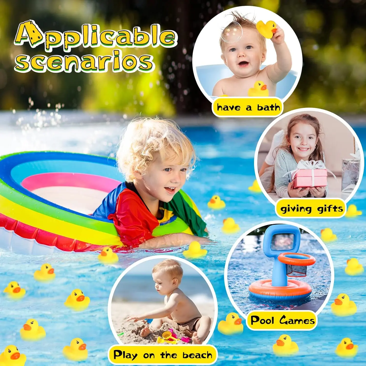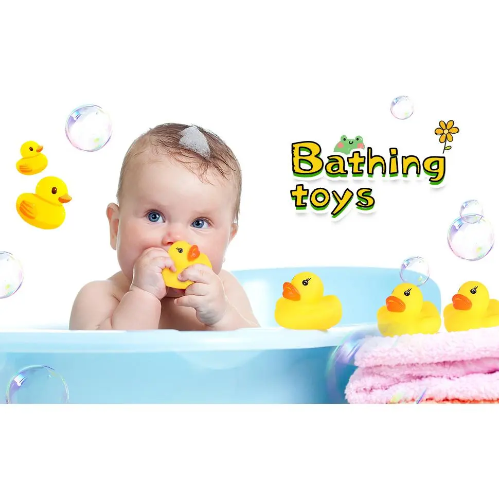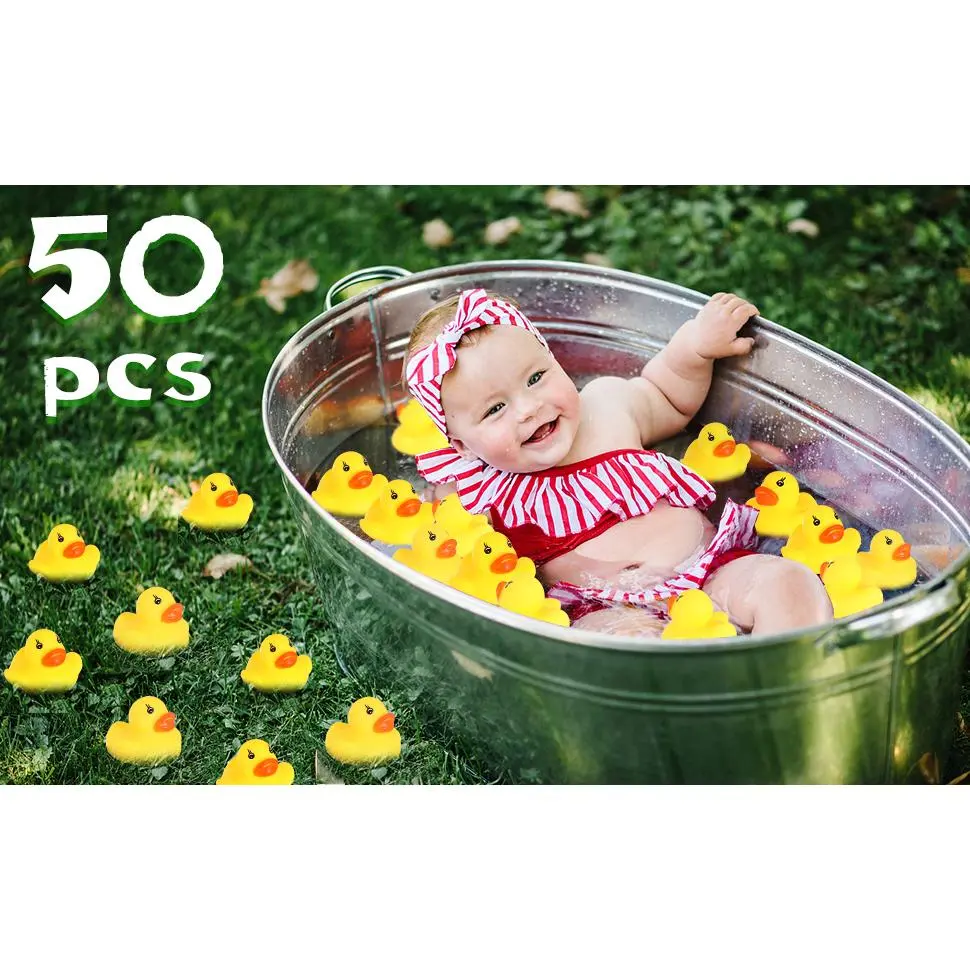 50 mini rubber ducks float upright and squeak when you squeeze them, making bath time more fun.