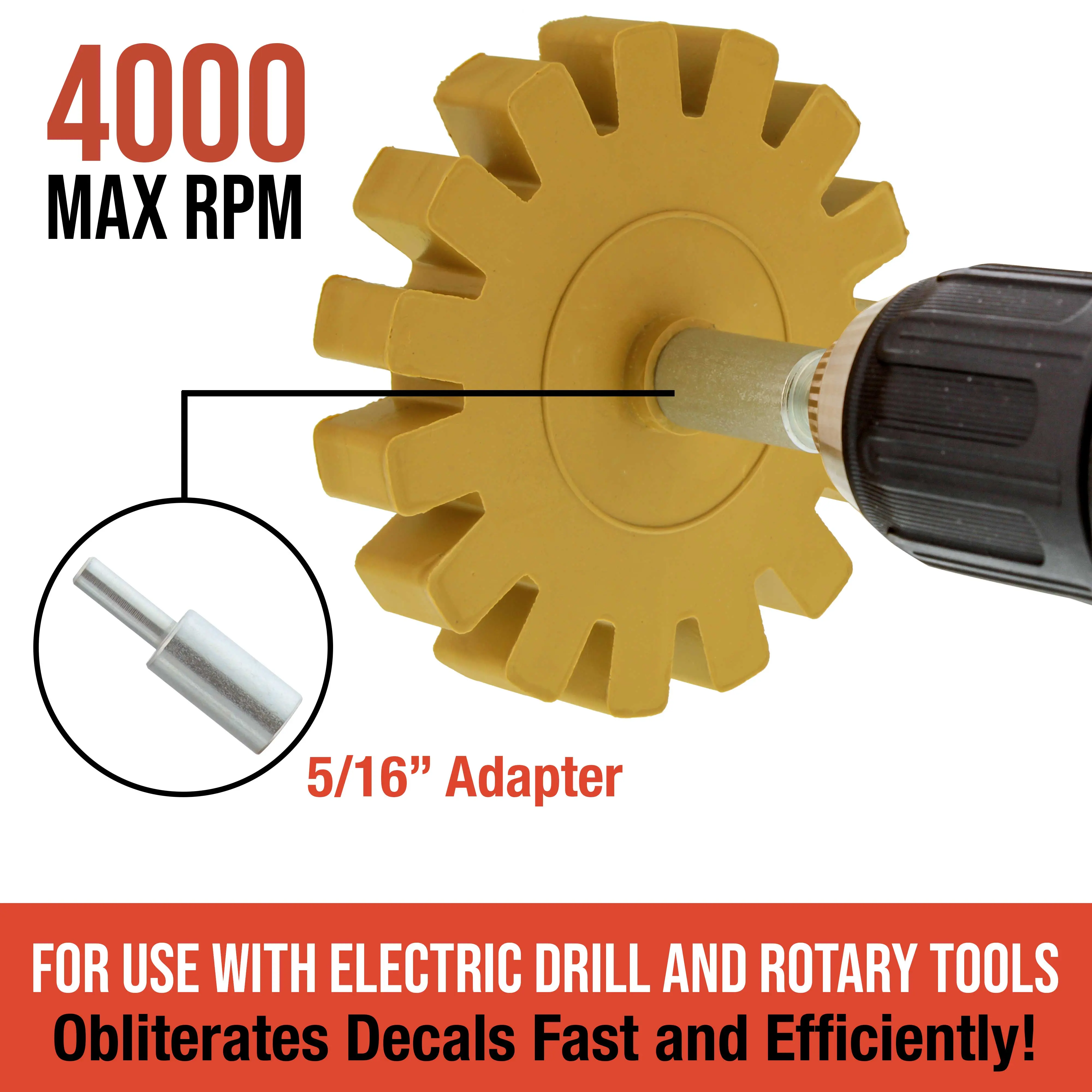 ·Obliterates Decals Fast and Efficiently: A durable, long-lasting 3.5" Knobby Slotted Edge Rubber Eraser Wheel Pad Tool that quickly removes adhesives and decals. This eraser wheel tool is designed for fast high-speed removal of pinstripes, decals, vinyl, tapes, graphics, flooring, double-sided molding, emblems, and trim adhesive from cars, trucks, motorcycles, RV's, signs, glass, windows, and other automotive, industrial, and household materials.