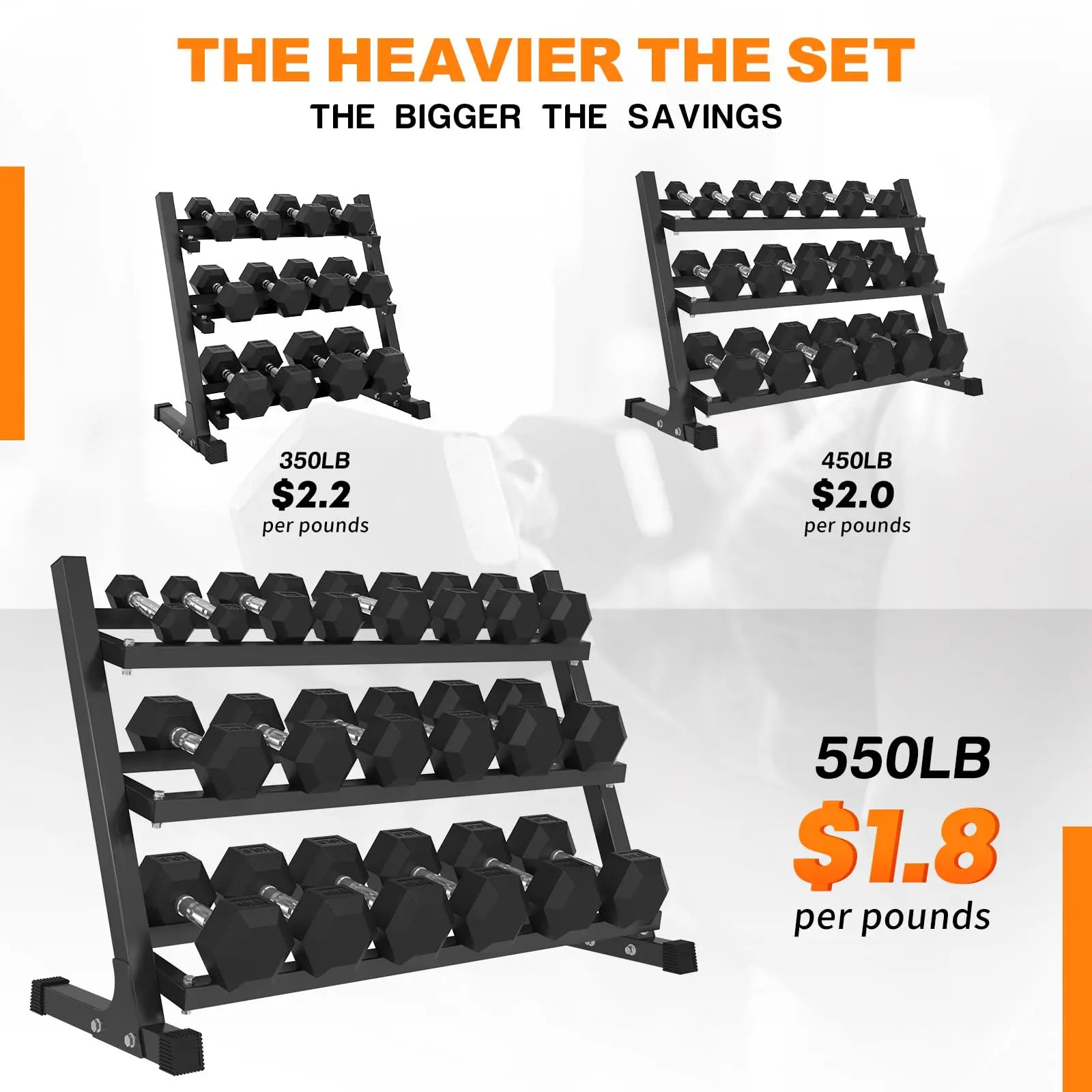 ·[Durable Storage Rack] Heavy-duty steel rack with black powder coating ensures long-lasting stability. Includes a 3-tier rack: 350LB set with a compact rack, 450/550LB sets with larger rack size.