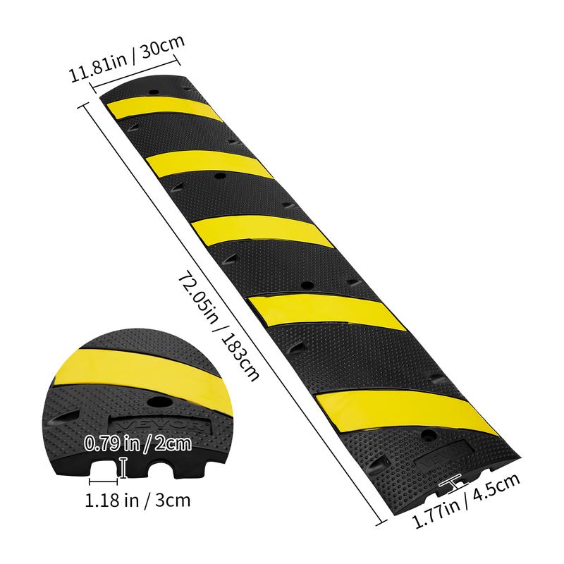 • Well Designed 1 Pack 2 Channel: Our speed bump is designed to slow down the driving speed to create a more secure environment for pedestrians and cyclists. You will receive 1 pack of one-piece design rubber speed humps measuring 72.05 x 11.81 x 1.77 in, which can be used in one lane and pass through one car. The dual 1.18 x 0.79 in channel groove design provides protection for your cables.