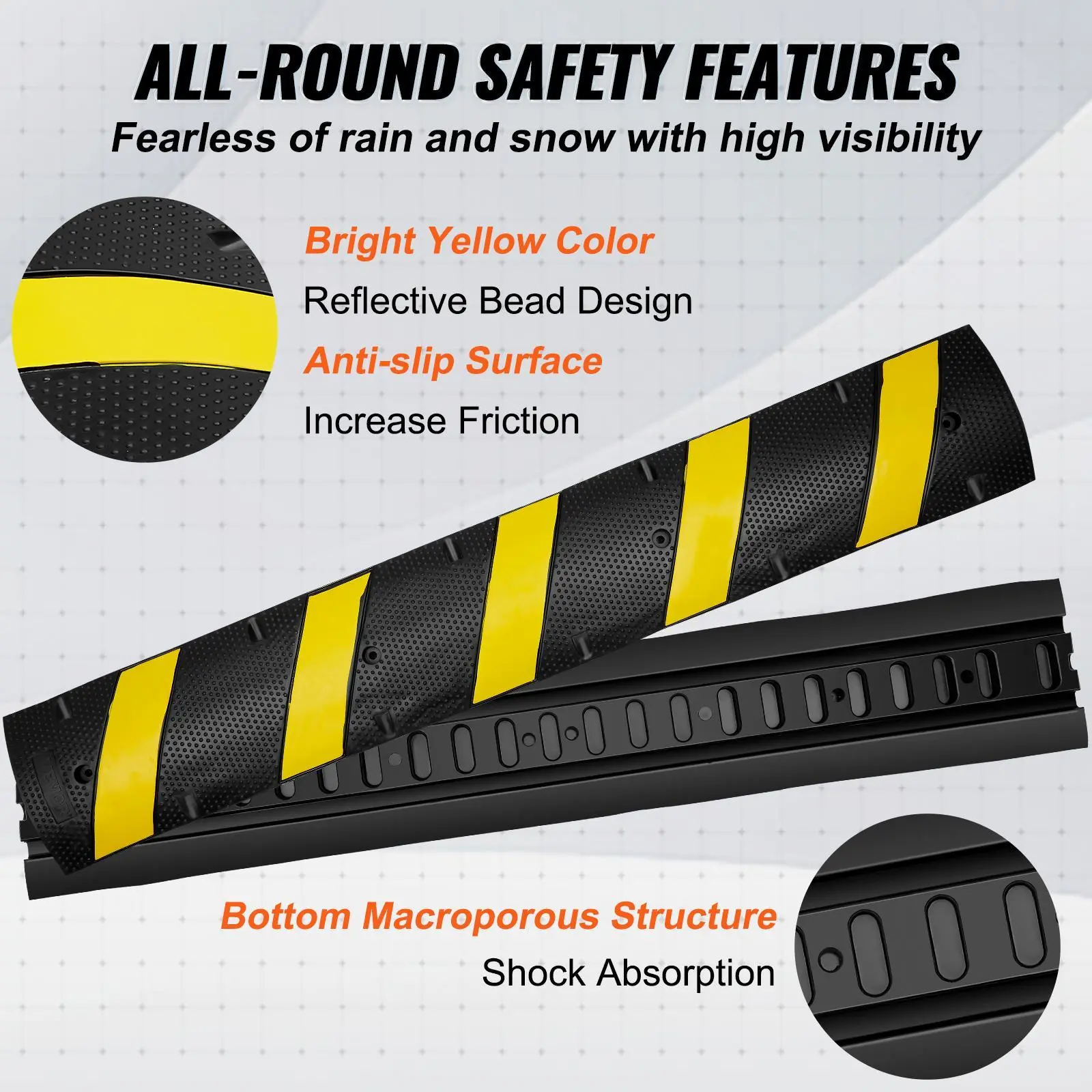 • Security You Can Trust: This speed bump hump boasts 22,000 lbs/axle maximum load capacity for vehicles to pass by easily. The yellow stripes and reflective bead structure are eye-catching and highly reflective, warning vehicles to slow down in advance and enhancing passers-by’s security. The anti-slip texture also enhances friction.