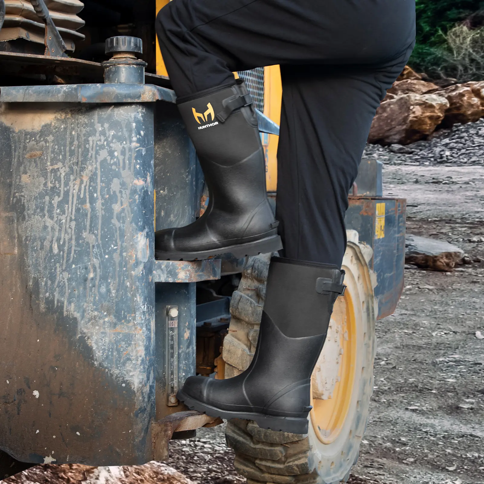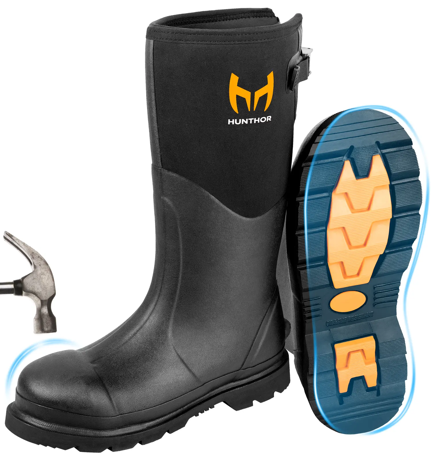 Hunthor rubber work boots offer 100% waterproof protection, steel toe protection, puncture-resistant sole, anti-slip design, and reliable insulation. Perfect for various outdoor work activities. 🌟