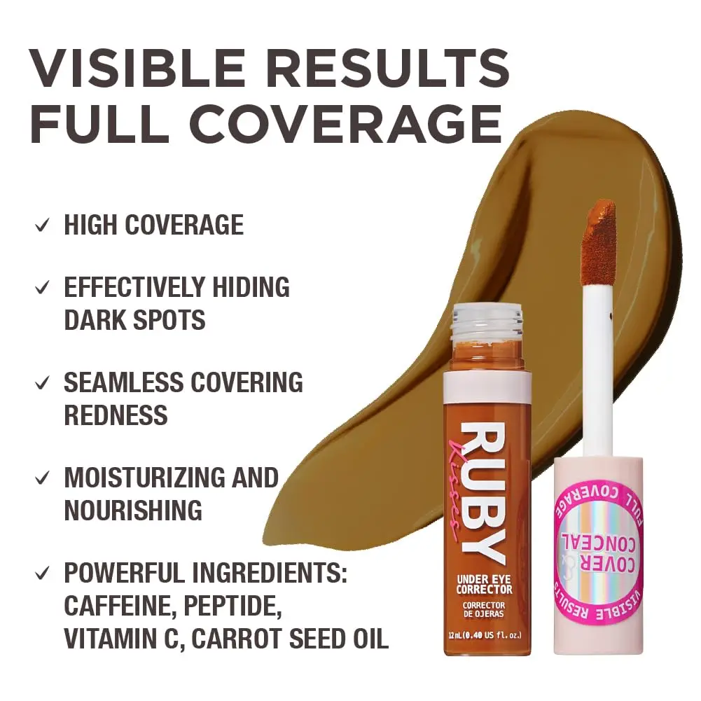 Ruby Kisses Under Eye Concealer, Full Coverage Makeup for Dark Circles, Redness, Hyperpigmentation, Blemishes, Moisturizing Satin Finish Formula With Caffeine & Peptides (410 Deep Honey, 0.40 Fl Oz)