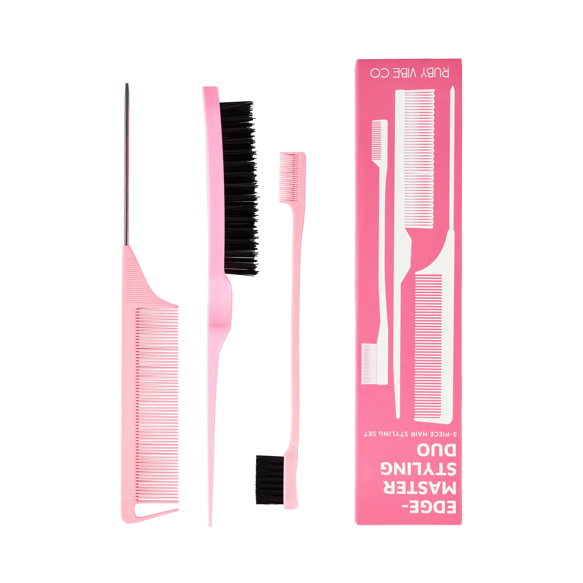·This 3-Piece Hair Styling Set includes an Edge Control Brush, Soft Bristle Brush, and Pointed Tail Comb.