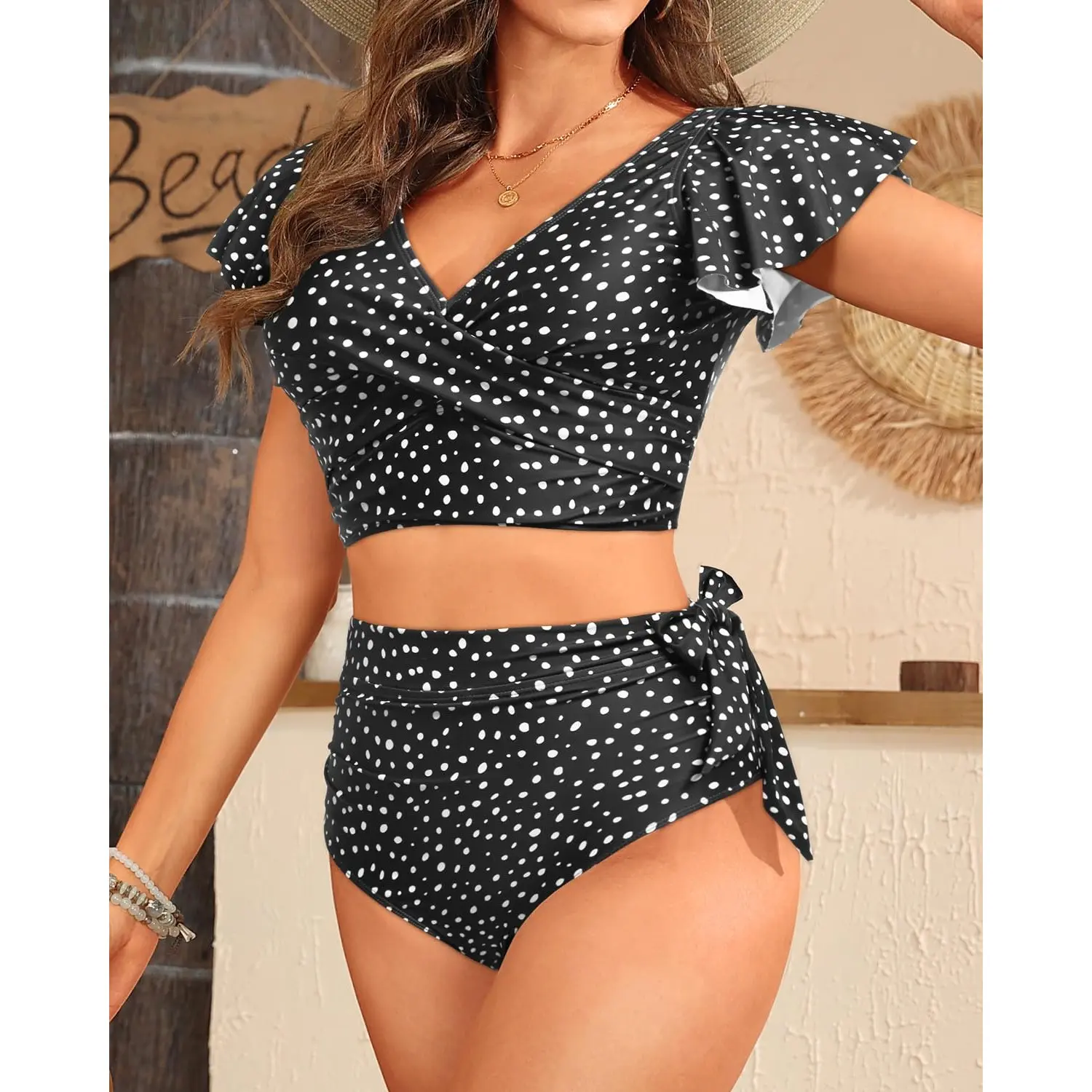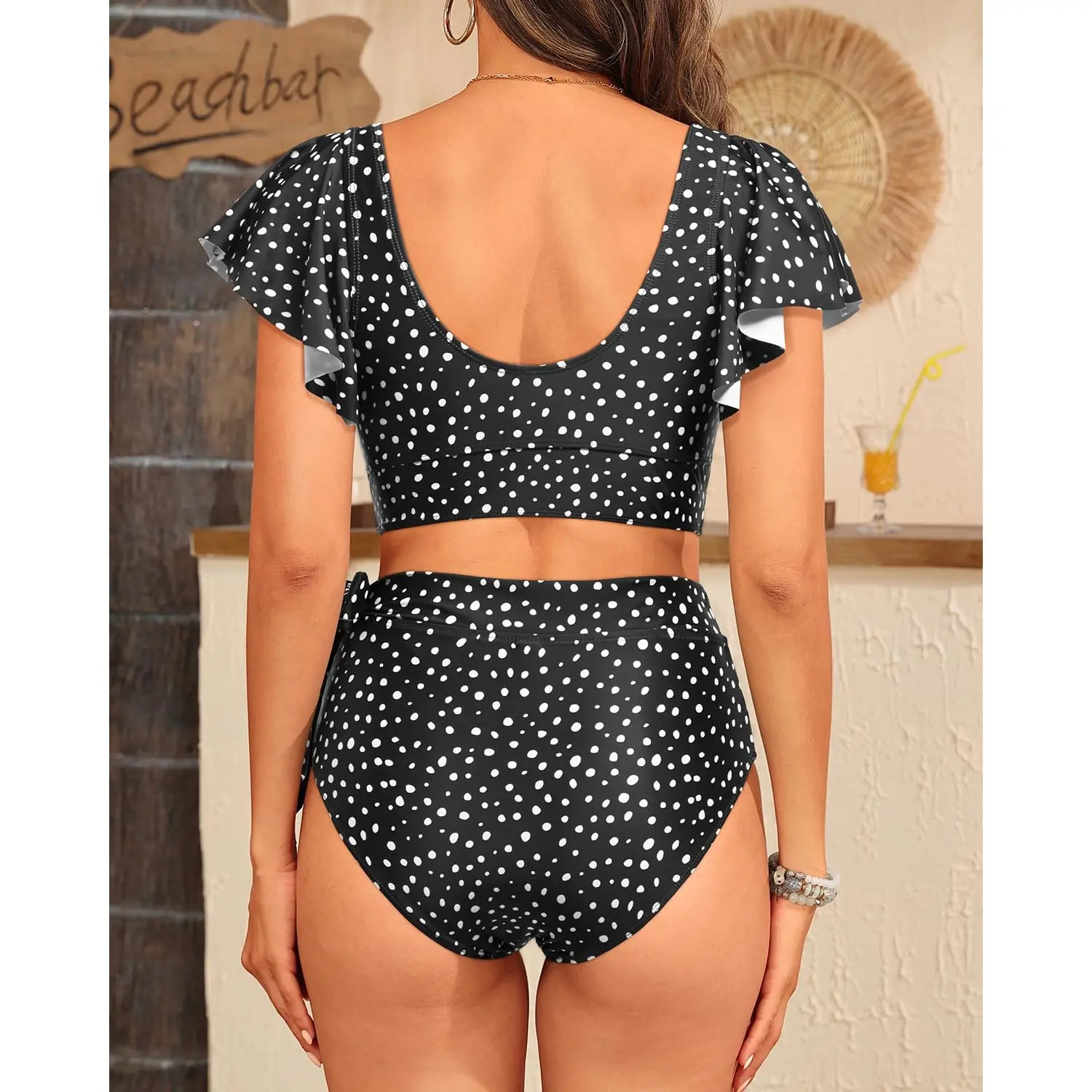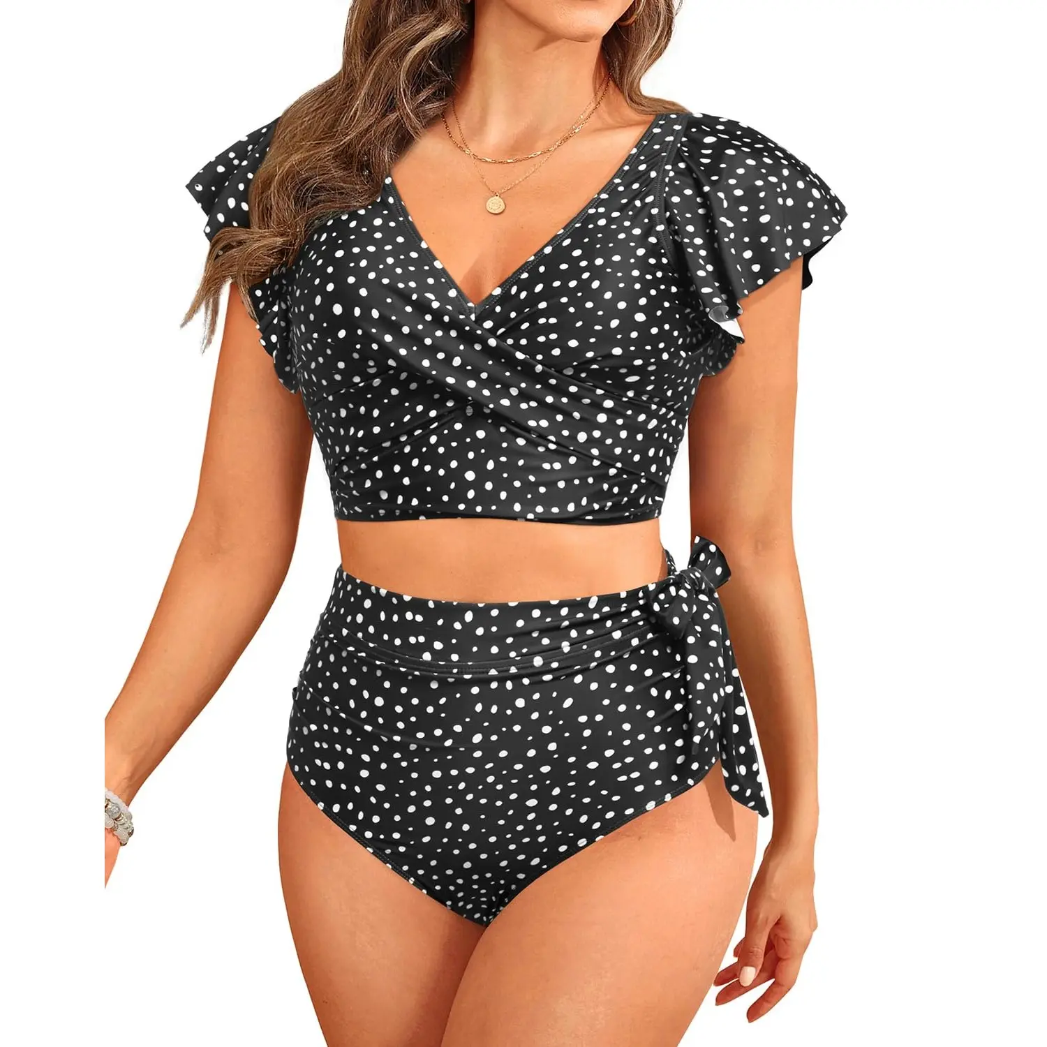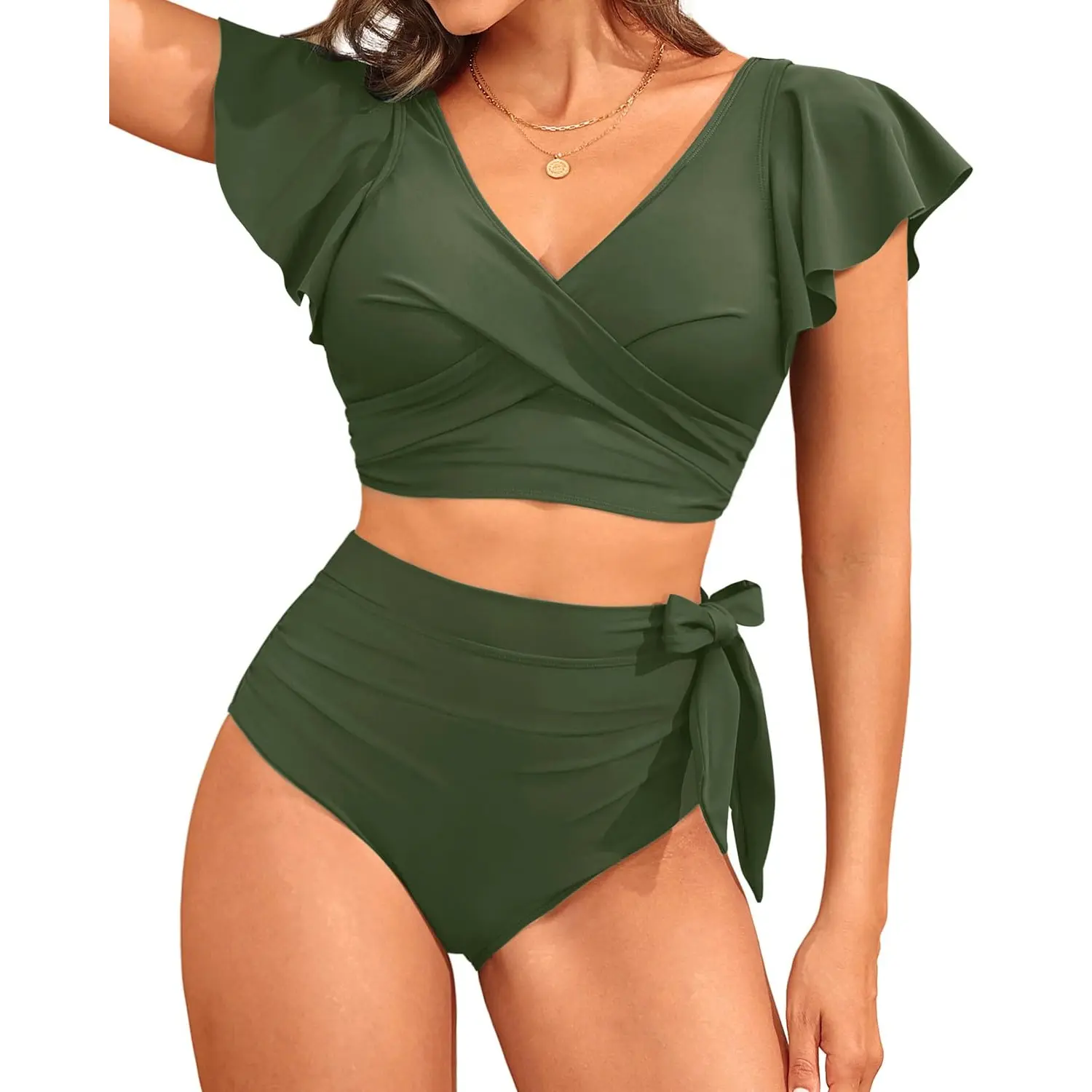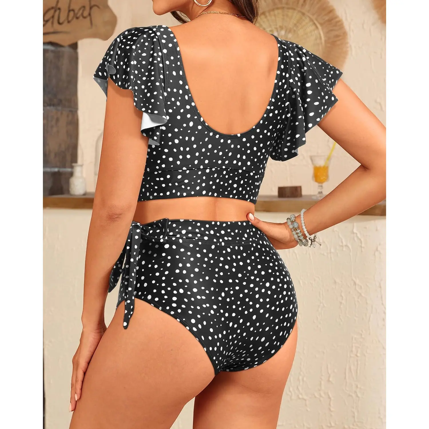 ·Two-Piece Swimsuit: The bikini set features ruffle sleeves, a V-neck, a twist front design, a U-back, and a bow knot high-waisted bottom.