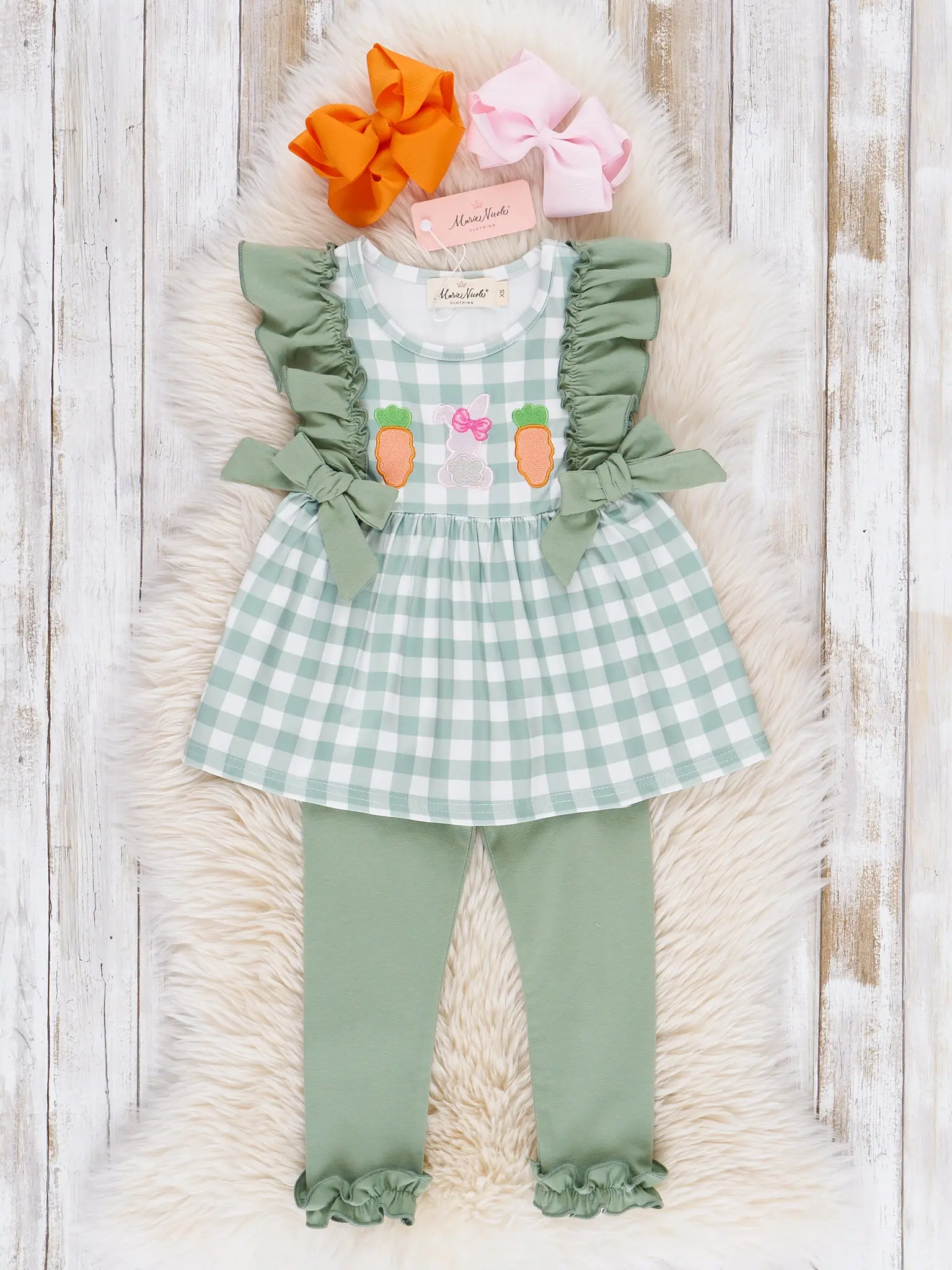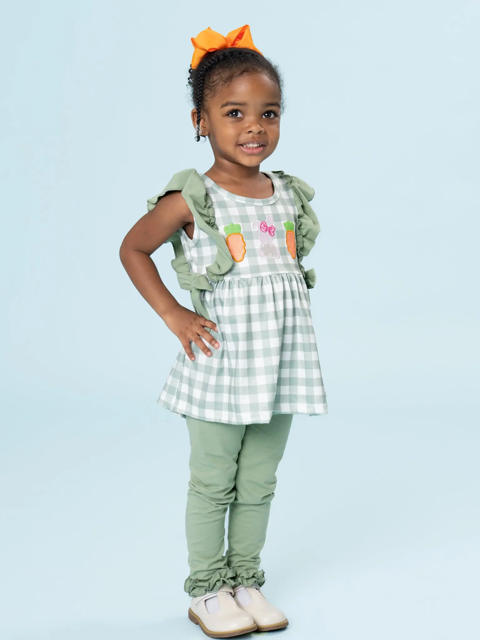 Get ready for Easter with our Gingham Carrot Patch Embroidered Outfit by Marie Nicole Clothing! This playful girls outfit features an adorable embroidered carrots and bunny design, perfect for the holiday. The ruffles & bows detail adds a touch of charm, while the gingham print screams spring along with the ruffle leggings.
