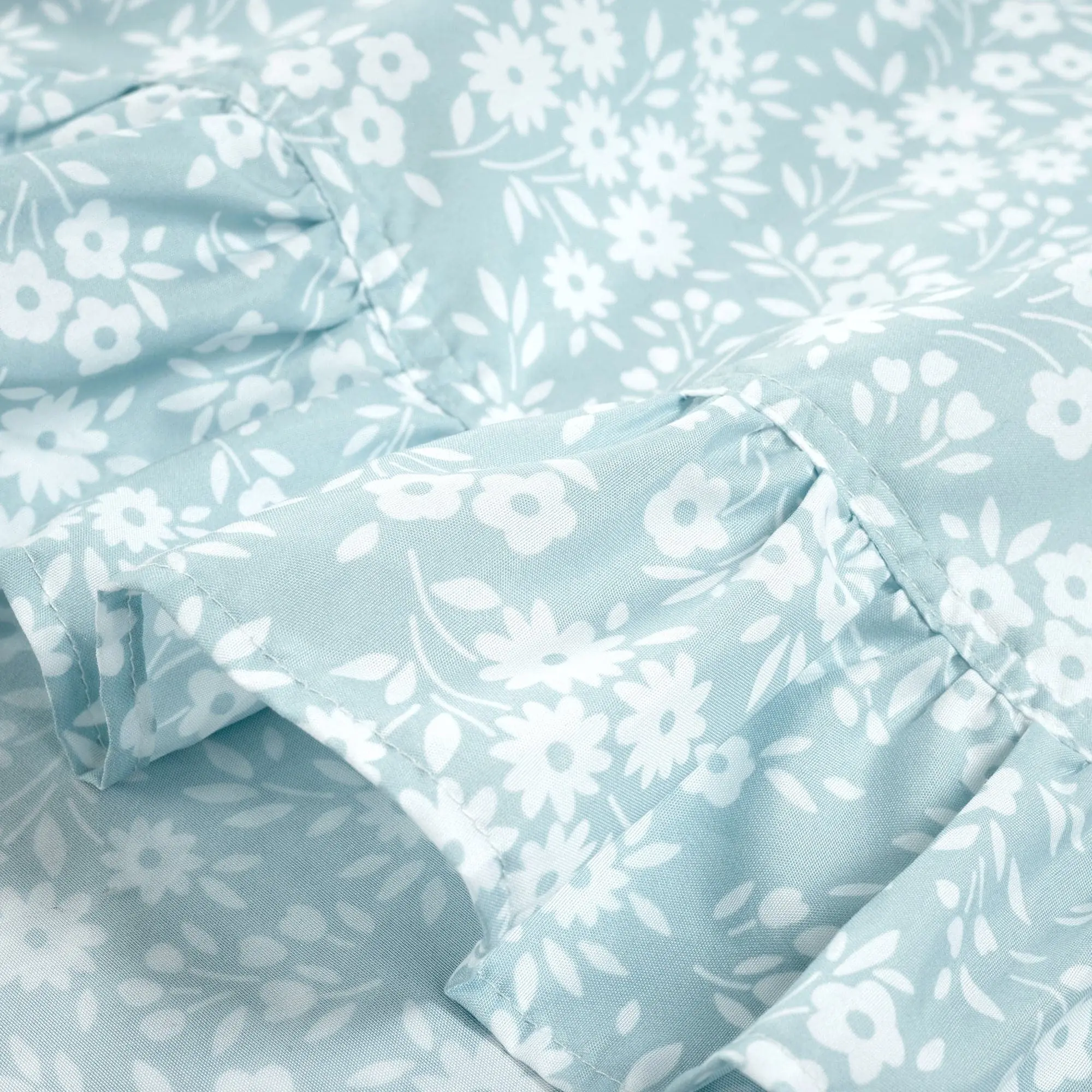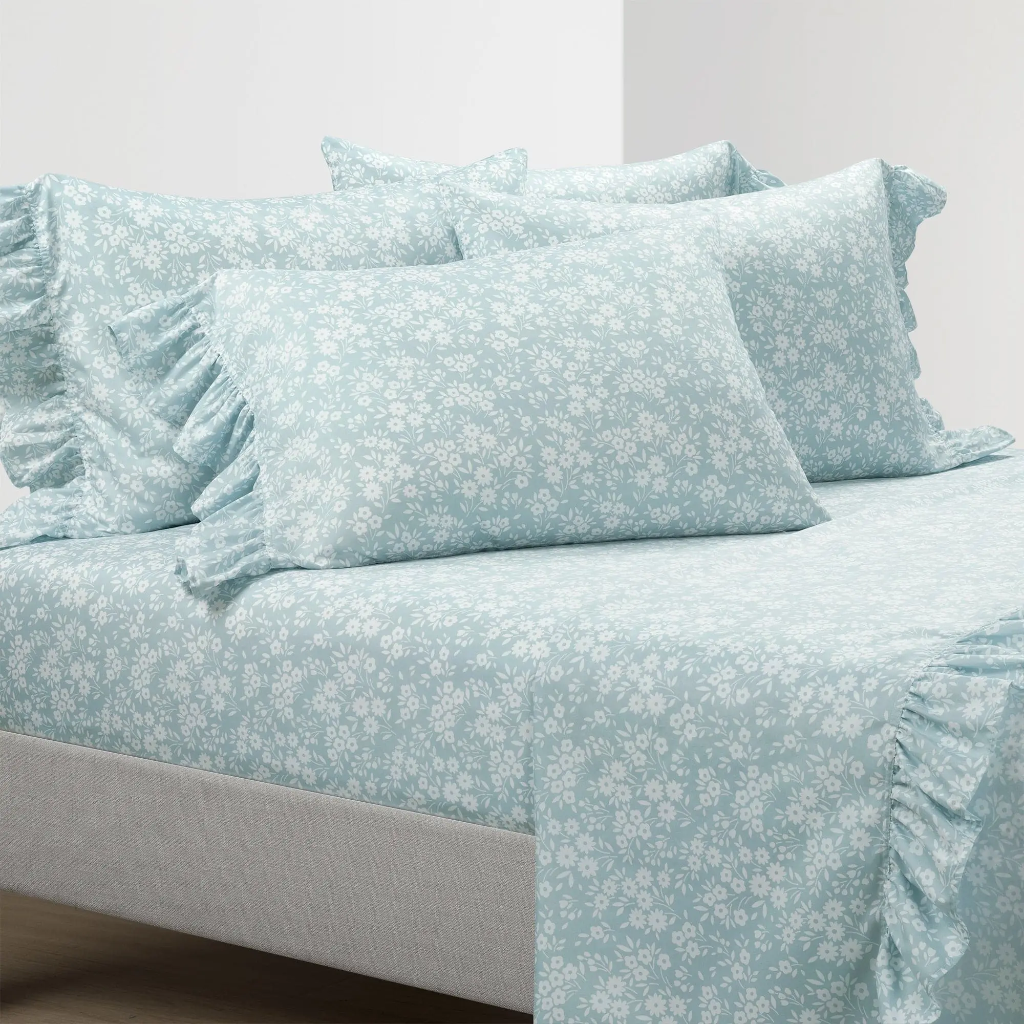 The flat sheet and pillowcases each have one edge of ruffles for a beautiful look and added texture. This Garden Of Flowers Ruffle Sheet Set is safe to machine wash and tumble dry. Follow all care instructions on the label to maintain the integrity of the ruffles and for long lasting use.