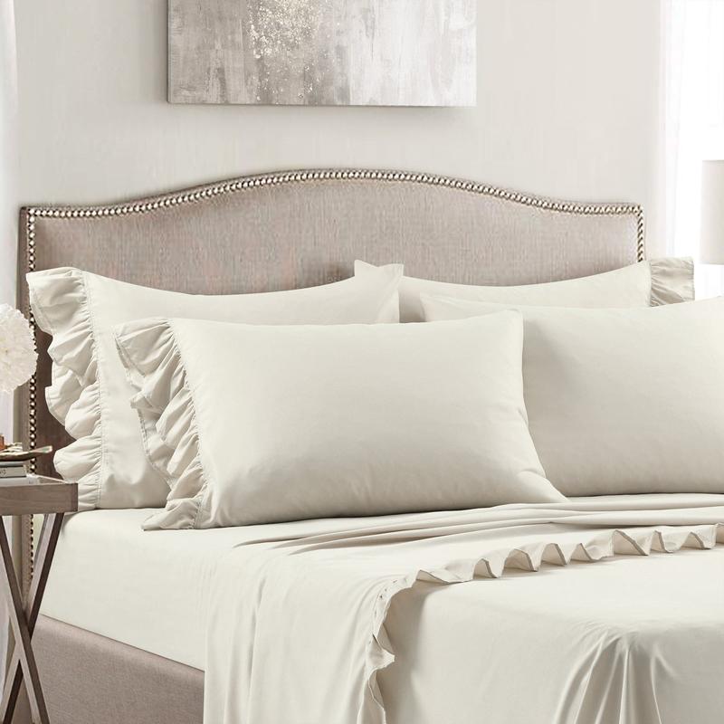 Pair your bedding with the Reyna Ruffle Sheet Set, which includes a flat sheet, fitted sheet, and matching pillowcases. The soft microfiber breathes easily, keeping you cool and comfortable. This set is perfect for completing your bed's look with a feminine frilly design. Pair it with your favorite quilt, comforter, or bedspread.
