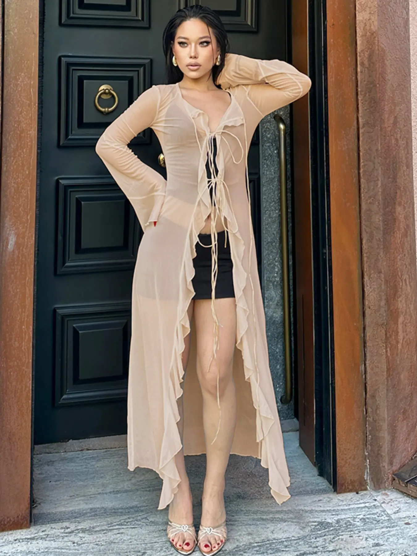 5. Women's Solid Sheer Ruffle Trim Tie Front Long Lightweight Mesh Cardigan Coat, Long Sleeve Open Front Outerwear for Spring & Fall, Ladies Clothes for Party Holiday