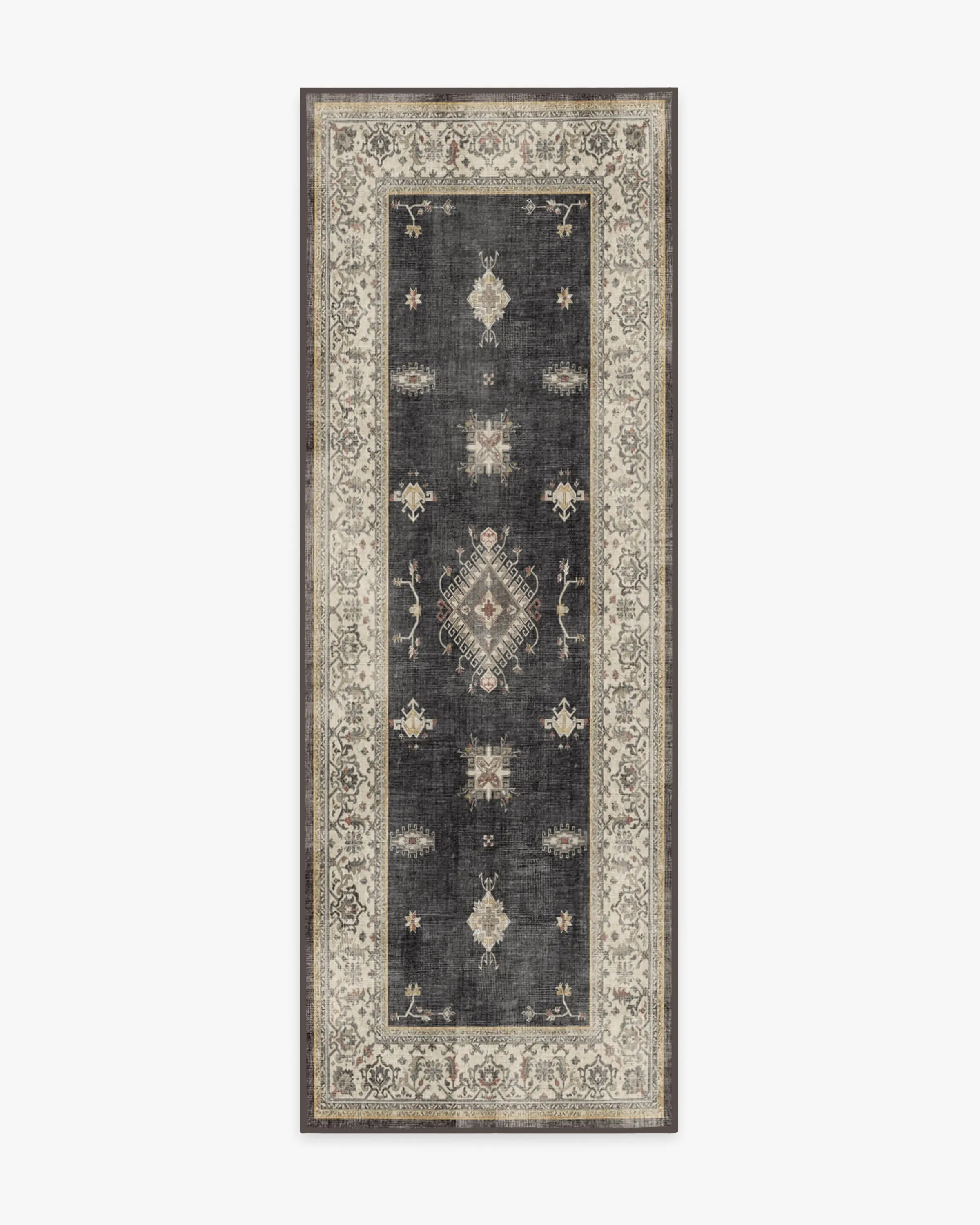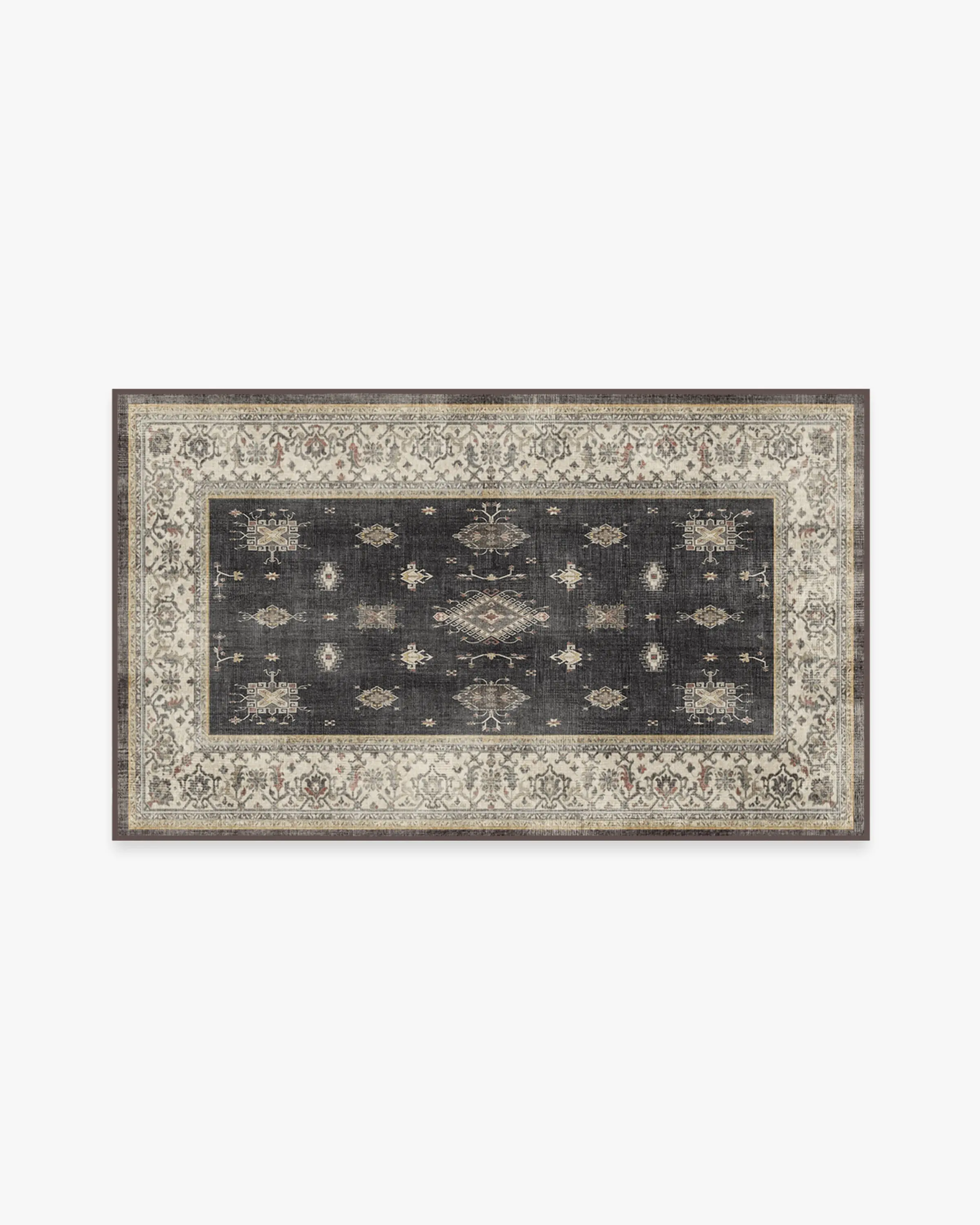 Verena Dark Wood Rug gives a classic Persian theme a modern farmhouse feel. This rug features an ornate border around intricate gem-like shapes that are spaciously spread out across an open field. Its color, a deep rustic brown that's almost black, is slightly distressed for that rustic appeal.