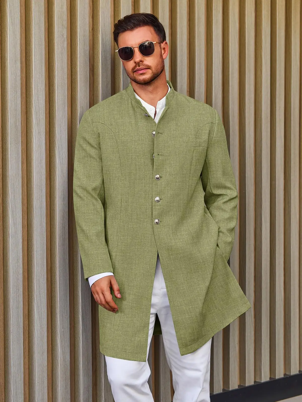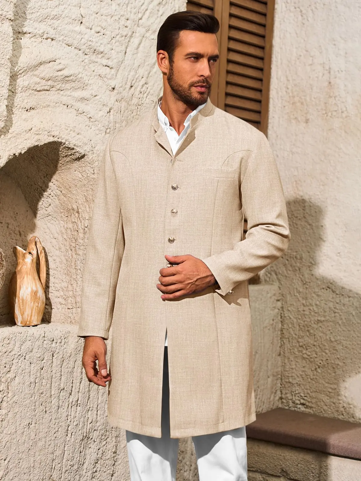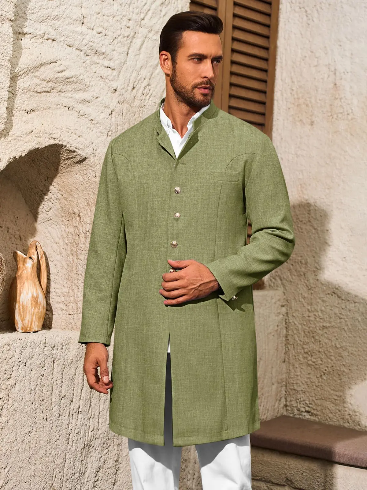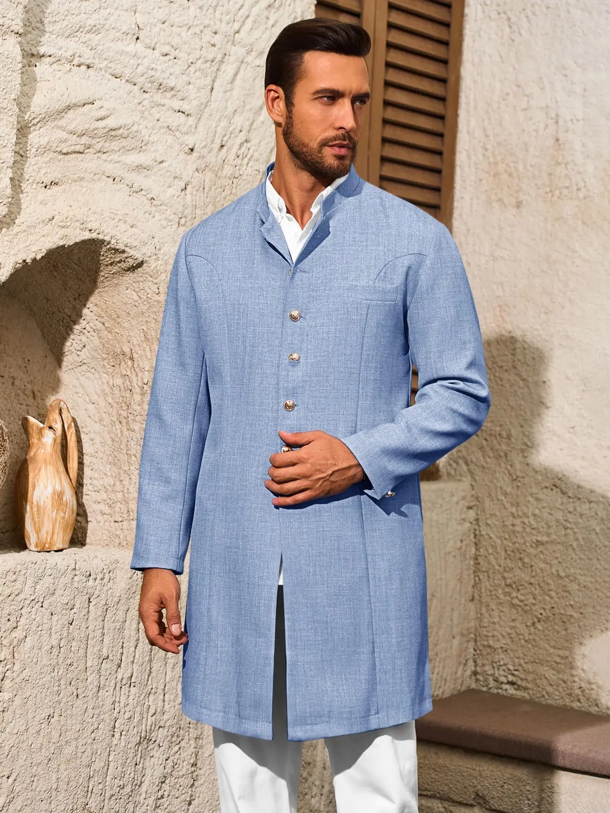 Features: These mens Kurta blazers are design with mandarin collar, button down closure, long sleeve with button design, two side pockets, one inner pocket, one chest pocket, solid color, and regular fit style. Create a unique and fashionable style that stands out