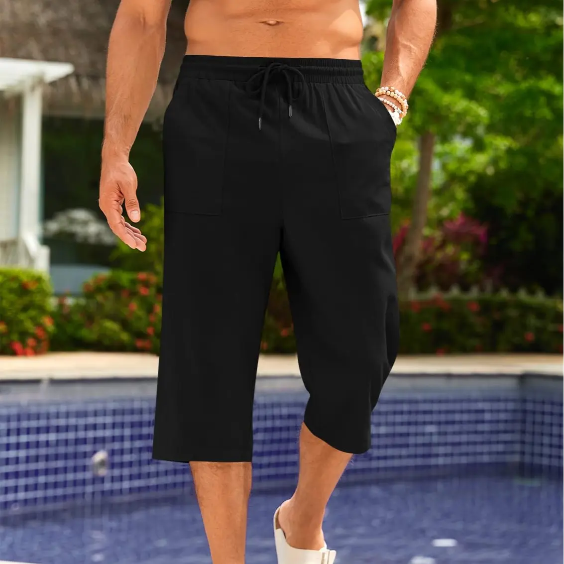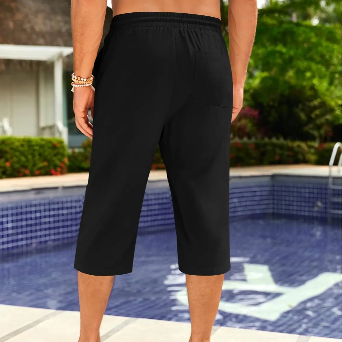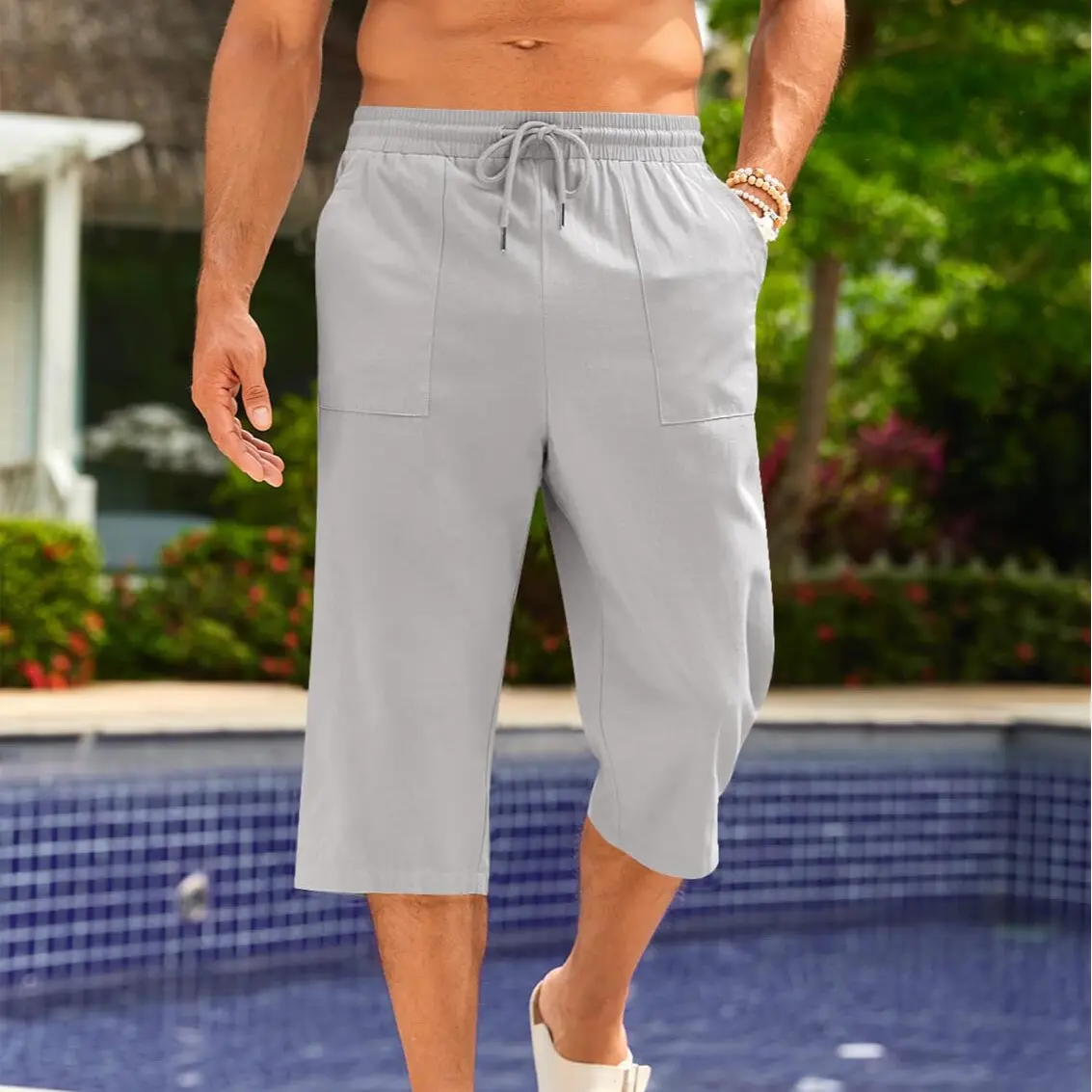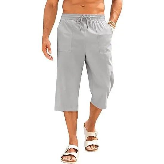 Capri Pants for Men: Mens linen pants. Elastic waist with adjustable drawstring provide the maximum comfort at the waist. Two diagonal deep pockets, and a pouch in the back to store small items, solid color and relaxed fit style