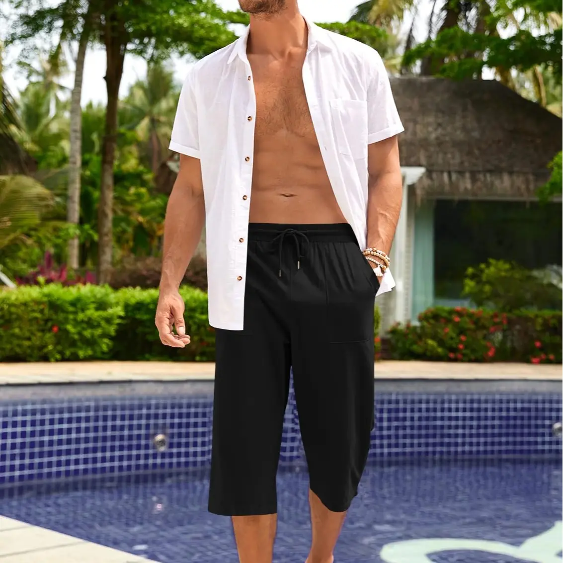 Clothing Match: Create a more outstanding look, you can try these capri pants with a linen shirt or a white t-shirt, vest, hawaiian shirts, sneakers, sandal, canvas shoes, flip flops and so on