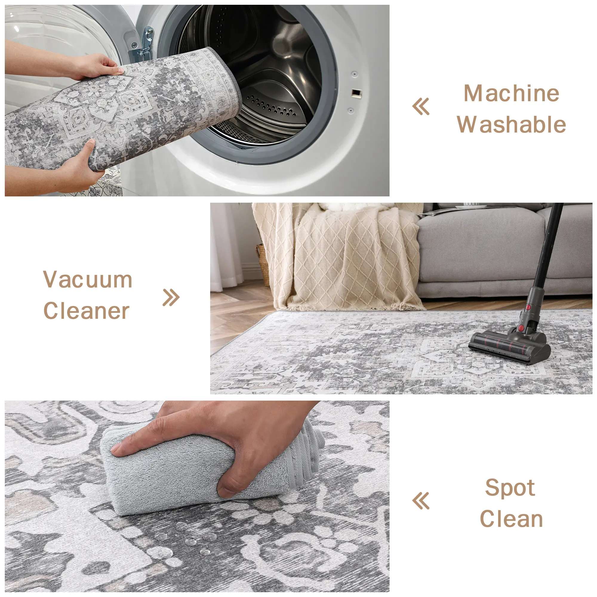 ·Machine Washable:Designed for convenience, this rug can be machine washed in cold water on a gentle cycle (no bleach). Air dry or use a no-heat dry cycle. For daily care, just vacuum or wipe. Its thin design makes removing pet hair a breeze.