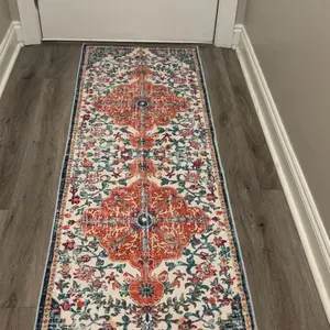 This rug, sized from 2'x6' to 2'x10', fits various spaces. Its vintage floral medallion design adds charm to hallways, kitchens, bedrooms, and more. Perfect for home decor enthusiasts, it enhances any room effortlessly. Ideal for those who love a touch of vintage flair in their living space.