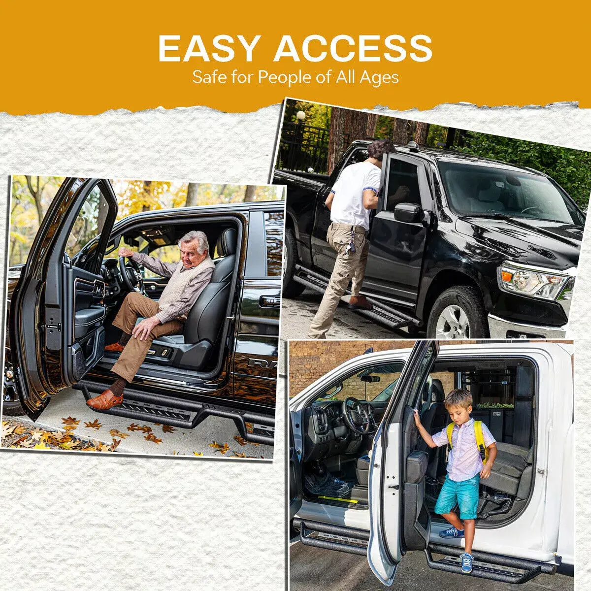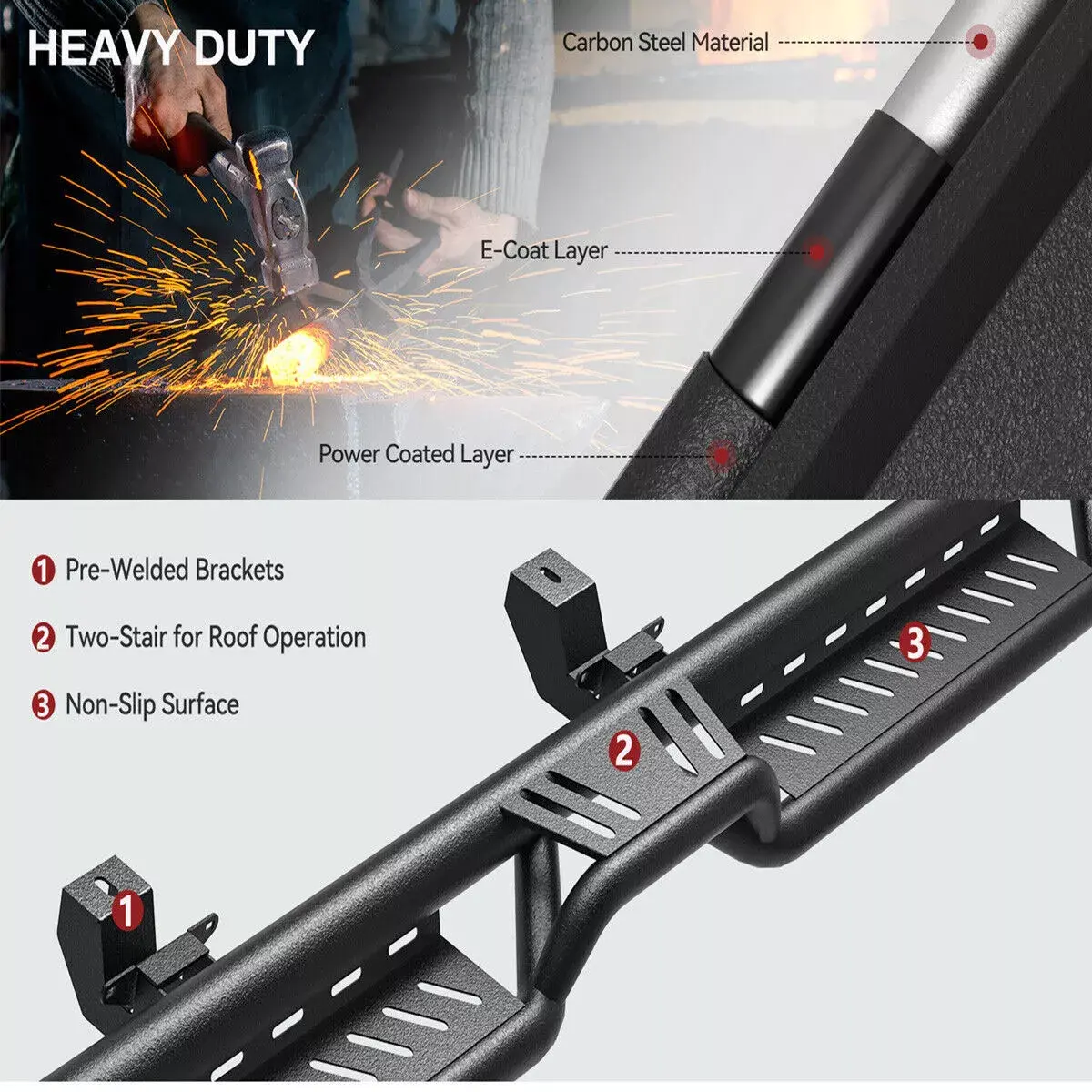 Two-Stair Layout: Unique two-stair layout makes these running boards easy for all ages to step in and out of the vehicle; The raised center step offers convenience for placing luggage or items on the roof