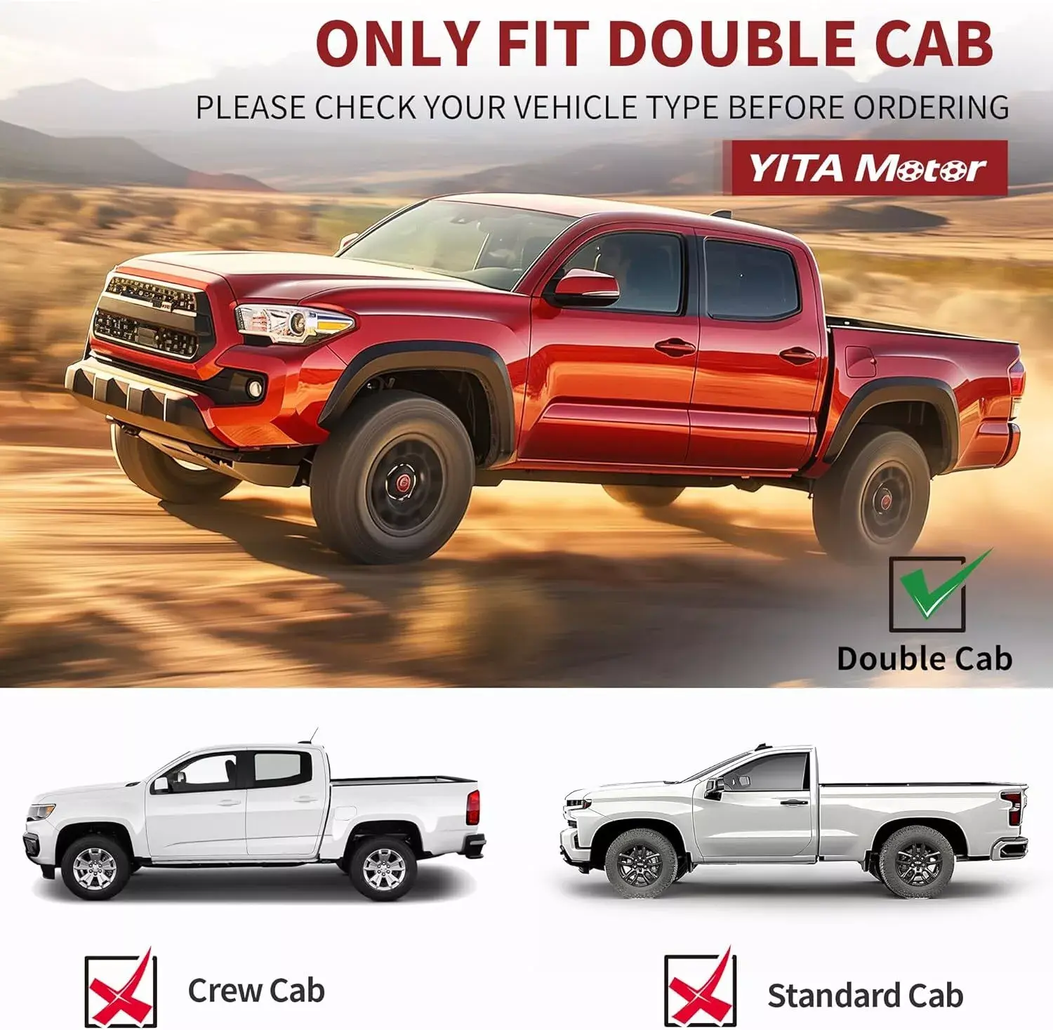 ·Only fits Double Cab with 4 full-size doors. Not for Access Cab with 2 full-size front doors & 2 suicide rear doors.