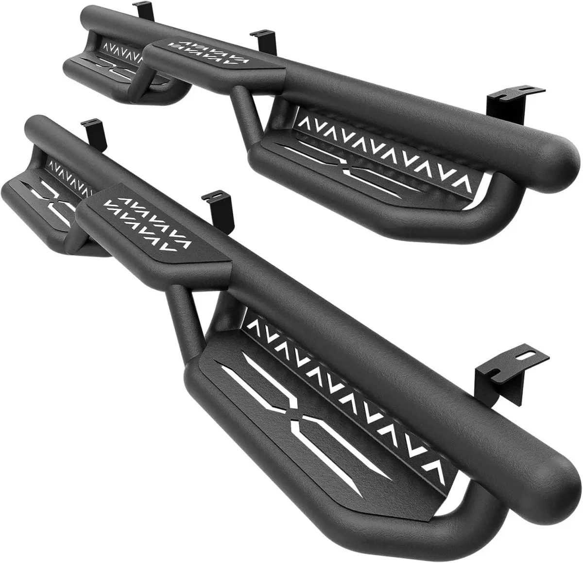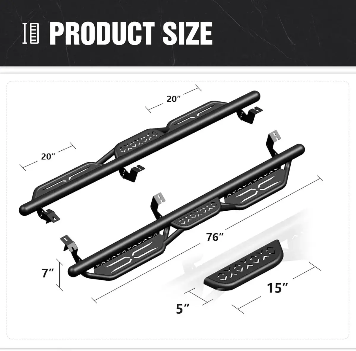 【Robust and Durable】: The high-quality black powder coating provides outstanding rust and corrosion resistance. Constructed from heavy-duty 2mm carbon steel, each side can withstand a weight of 550 pounds. Precision laser cutting and stamping techniques contribute to a non-slip step surface and enhanced traction.